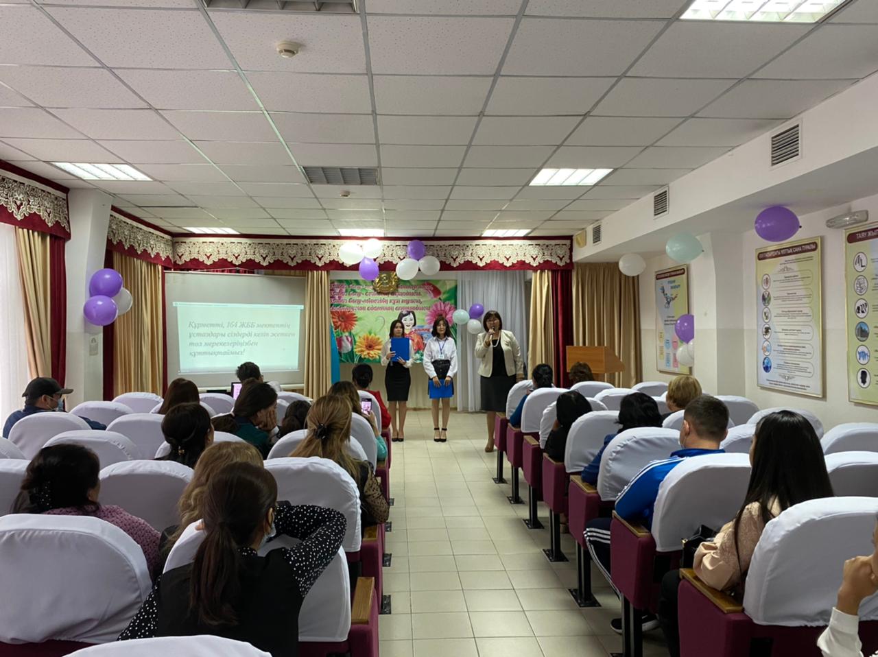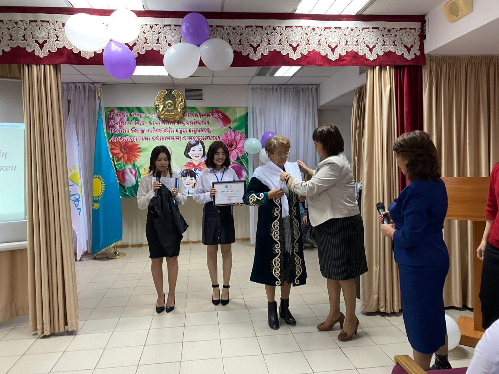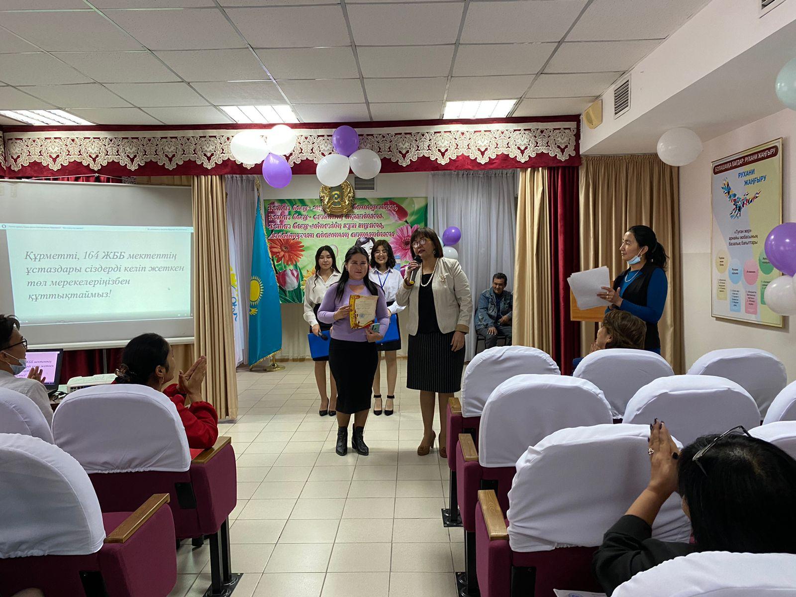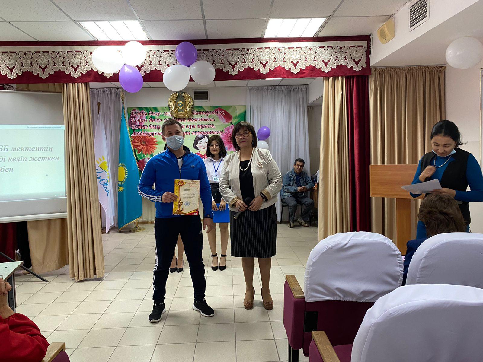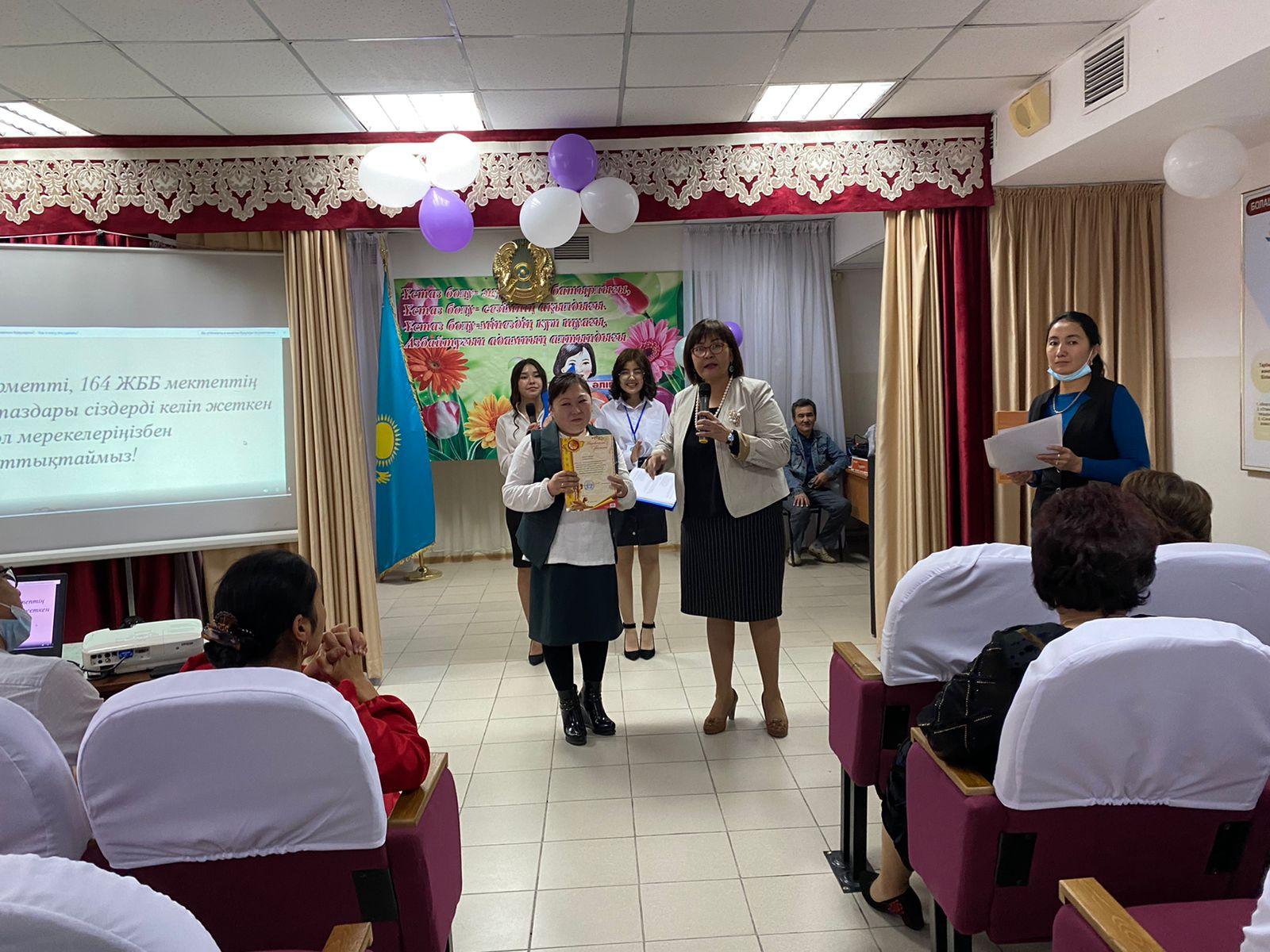 Мектеп директоры Б.А.Кусаинова мектебіміздің қазақ тілі мен әдебиет пәнінің ұстазы Амиреева Гулян Жанбосынқызын Алатау ауданының әкімі Қалдыбек Азамат Бескемпірұлының құрмет грамотасын салтанатты түрде табыстап, ұстаз