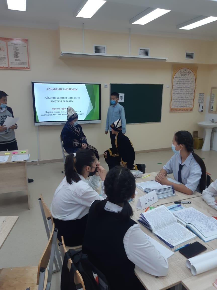 №164 Жалпы білім беретін мектеп » Ақпарат » Қоғамдық-гуманитарлық пәндер бірлестігінің онкүндігі аясында тарих пәні мұғалімі А.Сарина "Абылайханның ішкі және сыртқы саясаты" тақырыбында ашық сабақ өткізді. Оқушылар белсенділігі өтежақсы
