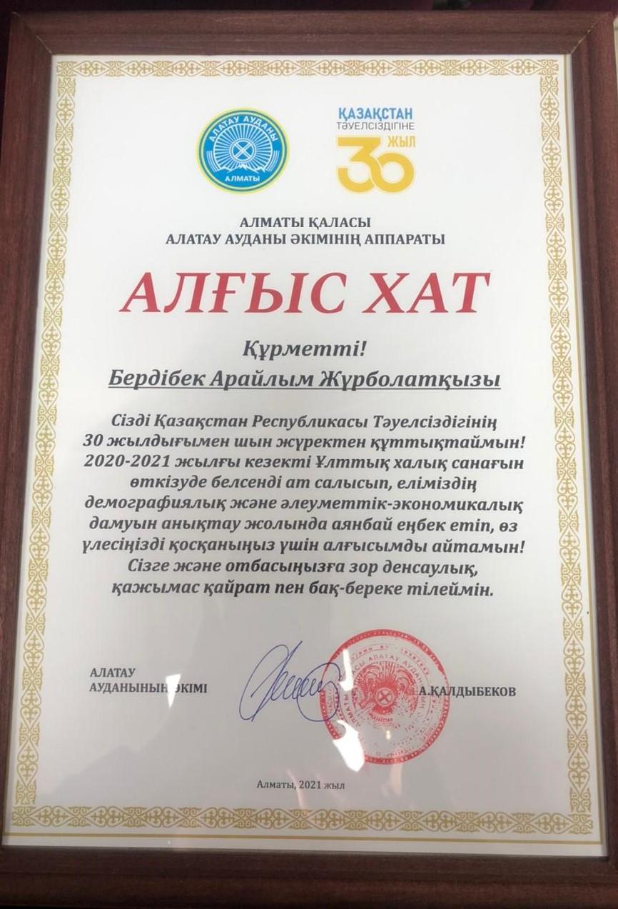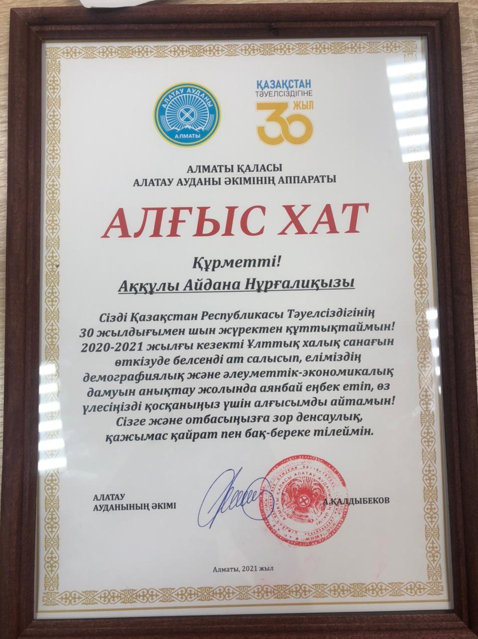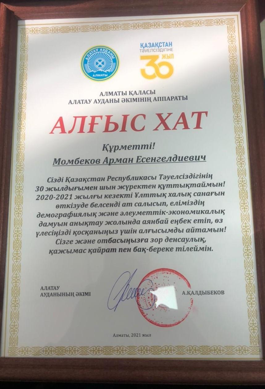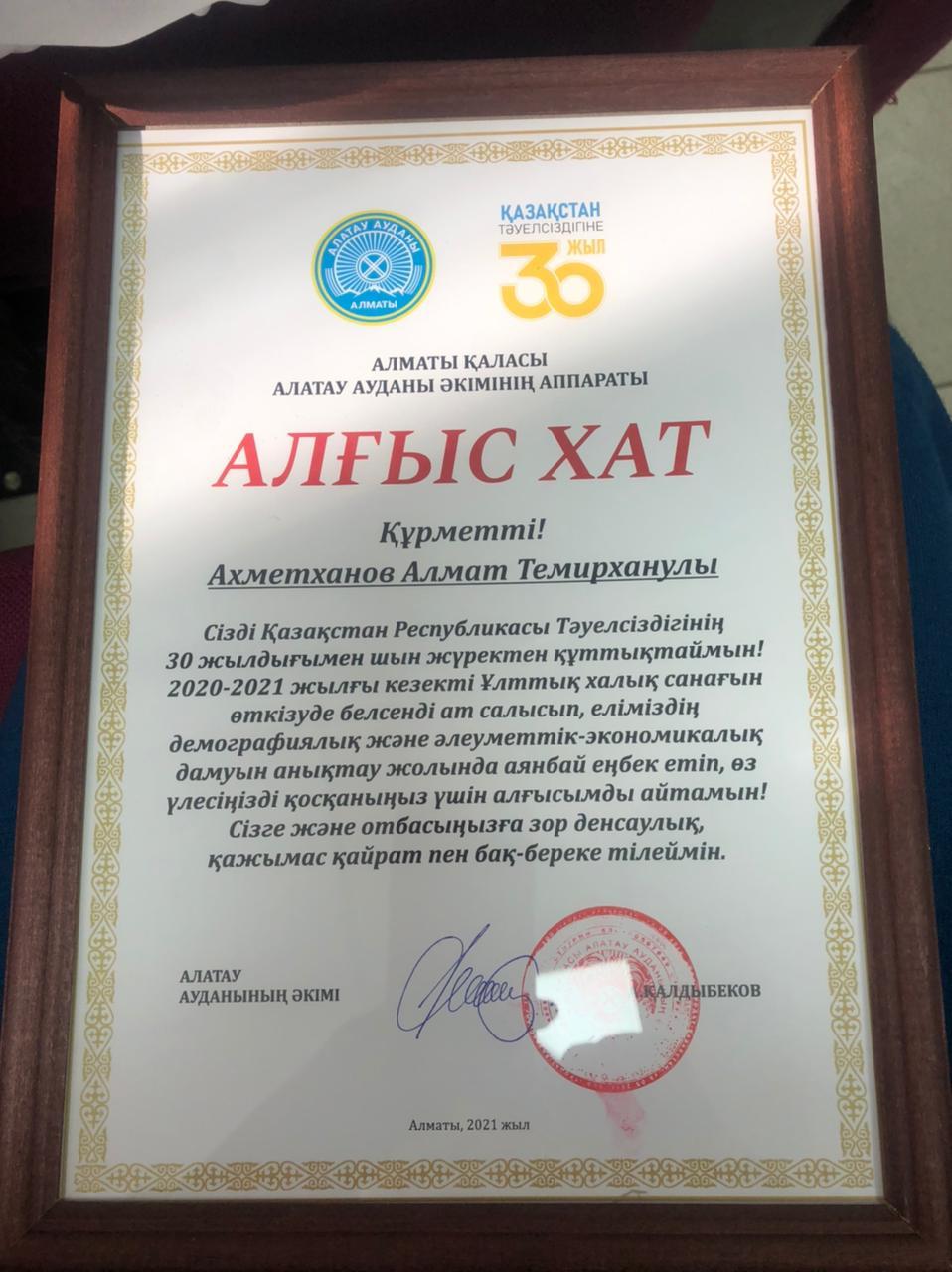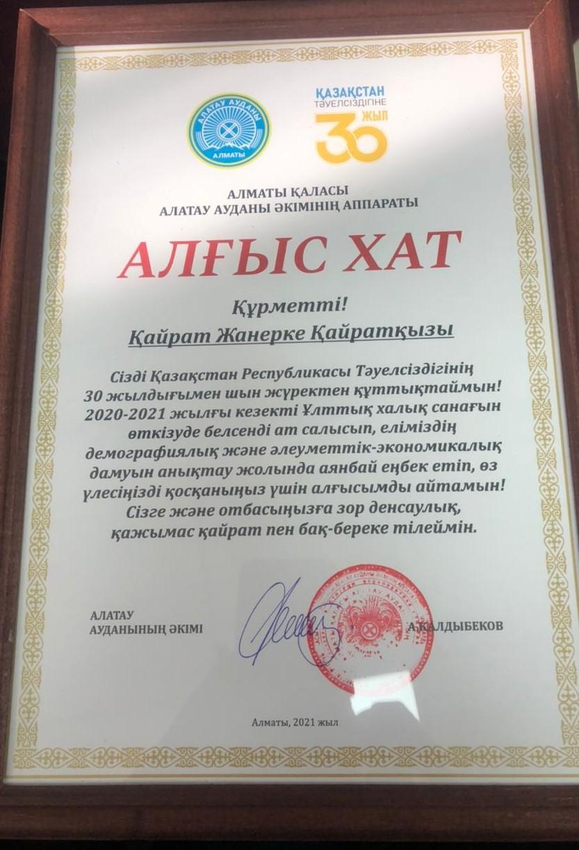 №164 Жалпы білім беретін мектеп » Ақпарат » №164 жалпы білім беретін мектептің ұстаздарын 2020-2021 жылғы кезекті Ұлттық халық санағын өткізуде белсенді ат салысқаны үшін, Алматы қаласы Алатау ауданы әкімі Қалдыбеков Азамат Бескемпірұлының атынан АЛҒЫС ХАТПЕН марапатталды. Құттықтаймыз!
