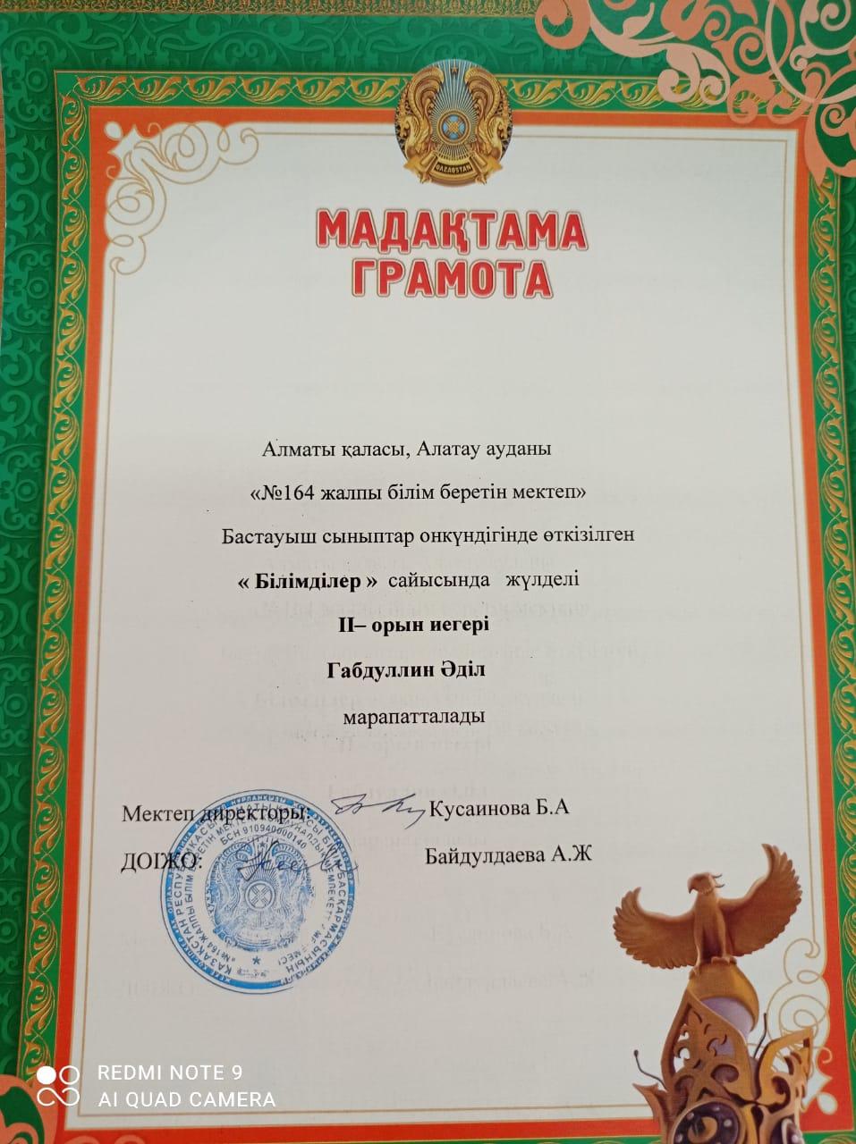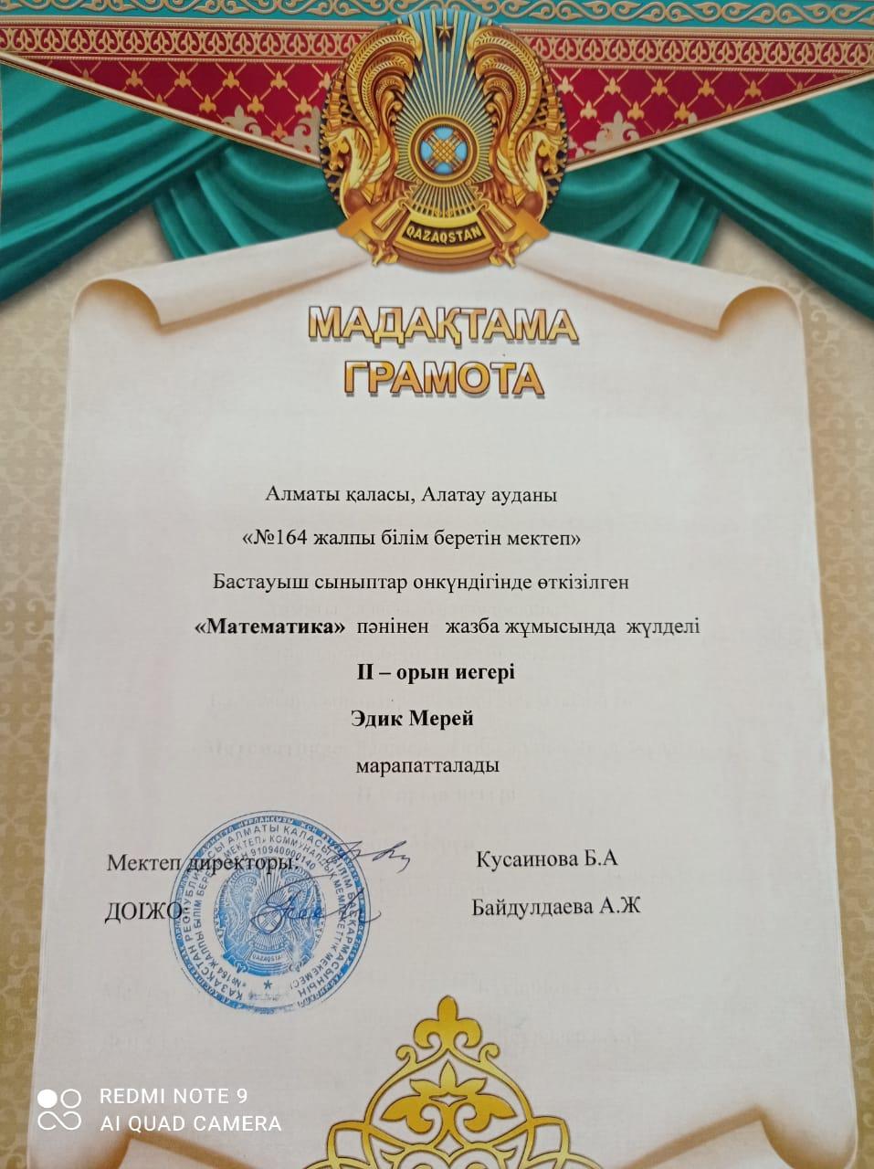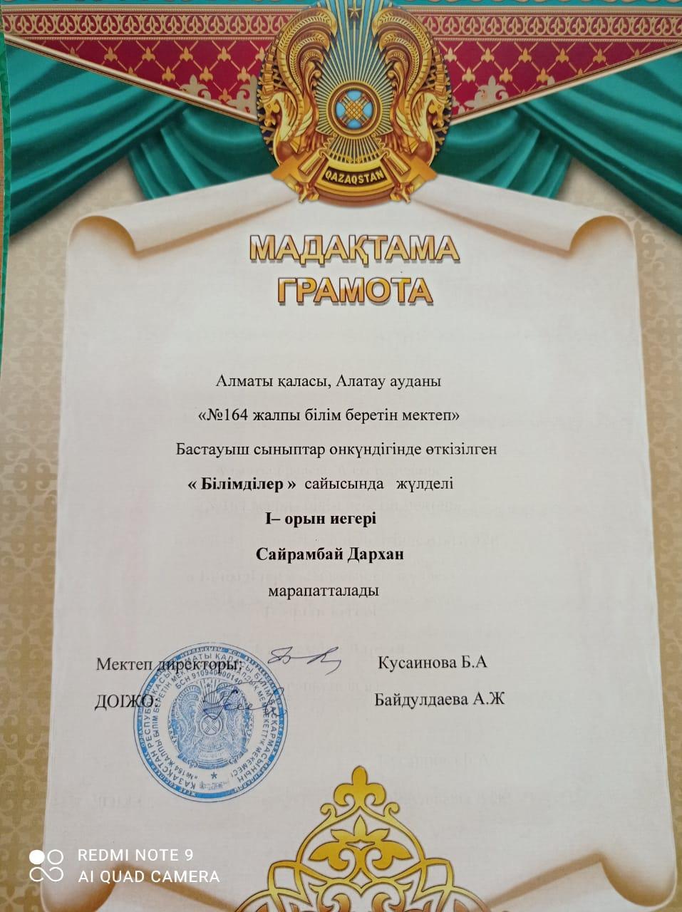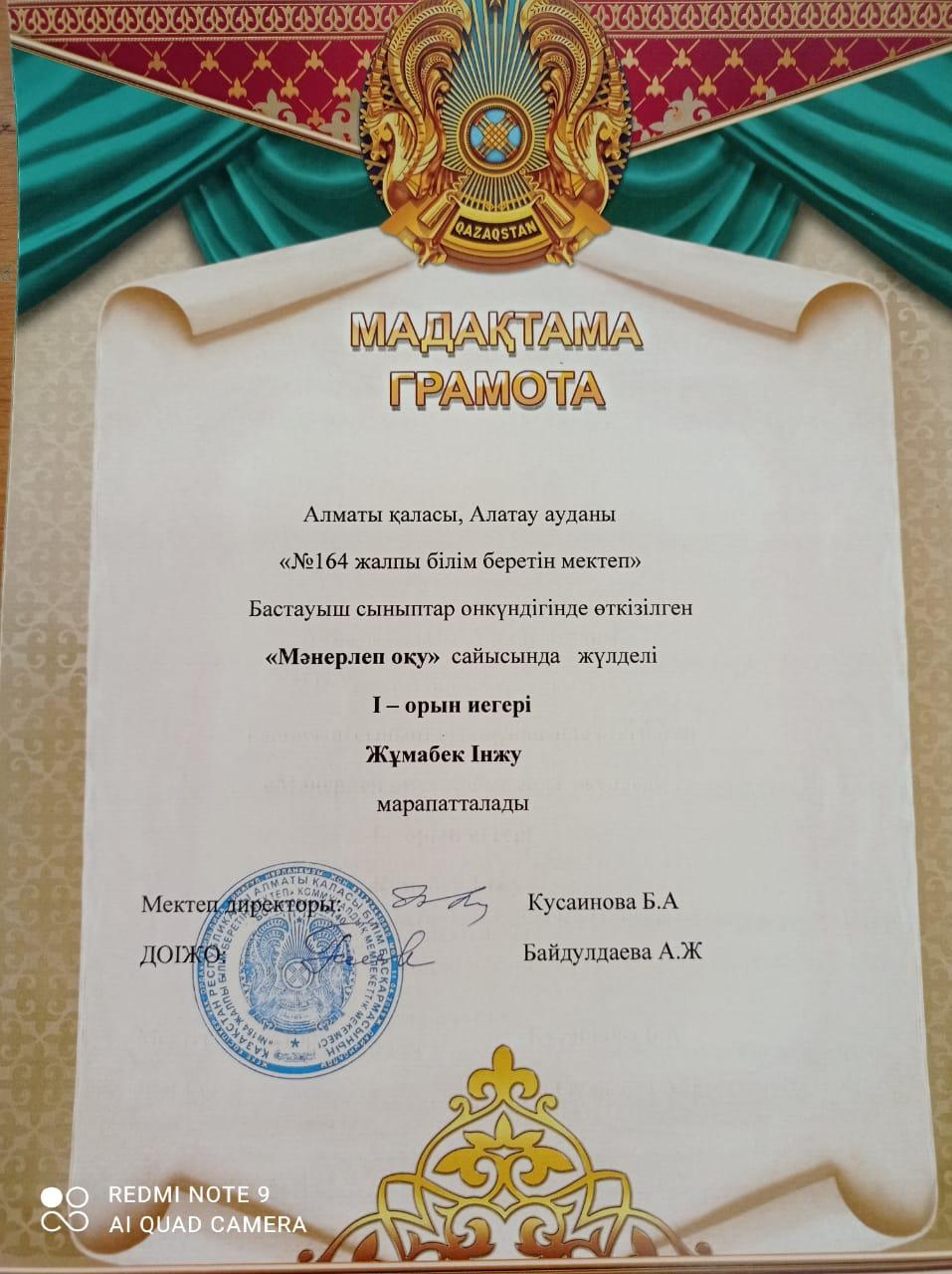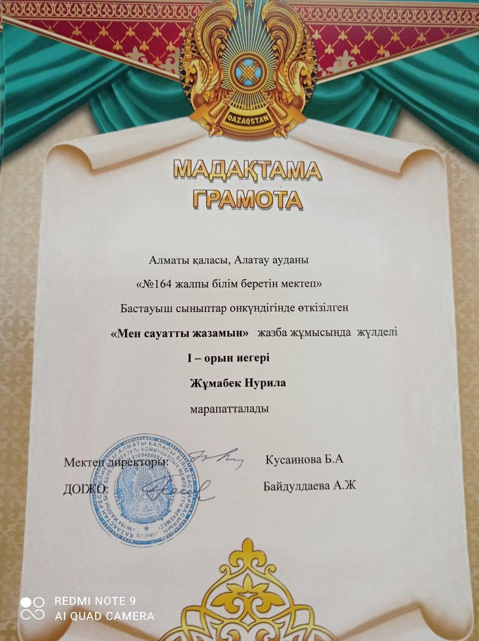 №164 Жалпы білім беретін мектеп » Ақпарат » Мектебімізде бастауыш сыныптар онкүндігінде "Математика", "Мен сауатты жазамын", "Қыс көрінісі" сурет салу, "Білімділер", "Мәнерлеп оқу" сайыстарында жүлделі орынға ие болған оқушылар.