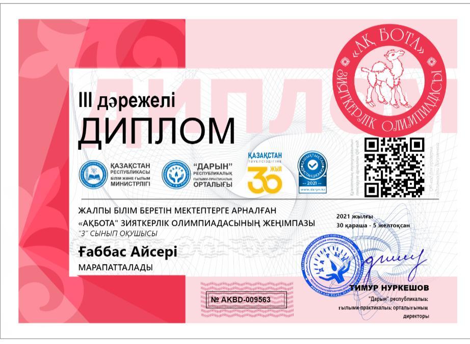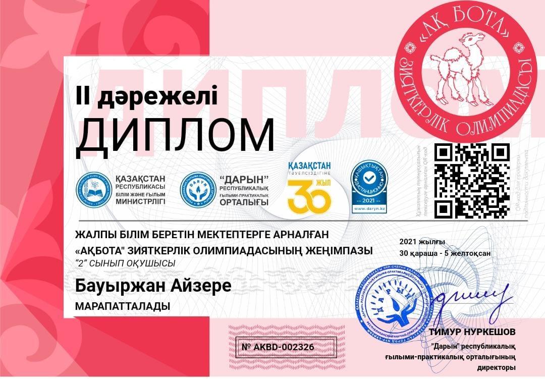 "Дарын" Республикалық ғылыми-практикалық орталығы ұйымдастырған "Ақбота" зияткерлік олимпиадасына 2-4 сынып оқушылары қатысып, жүлделі орындарға ие болды.