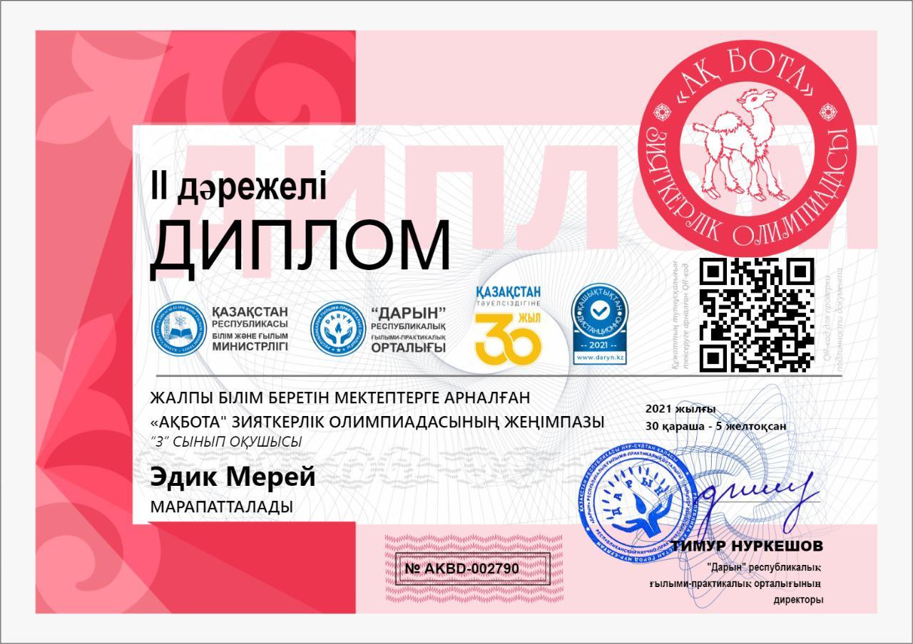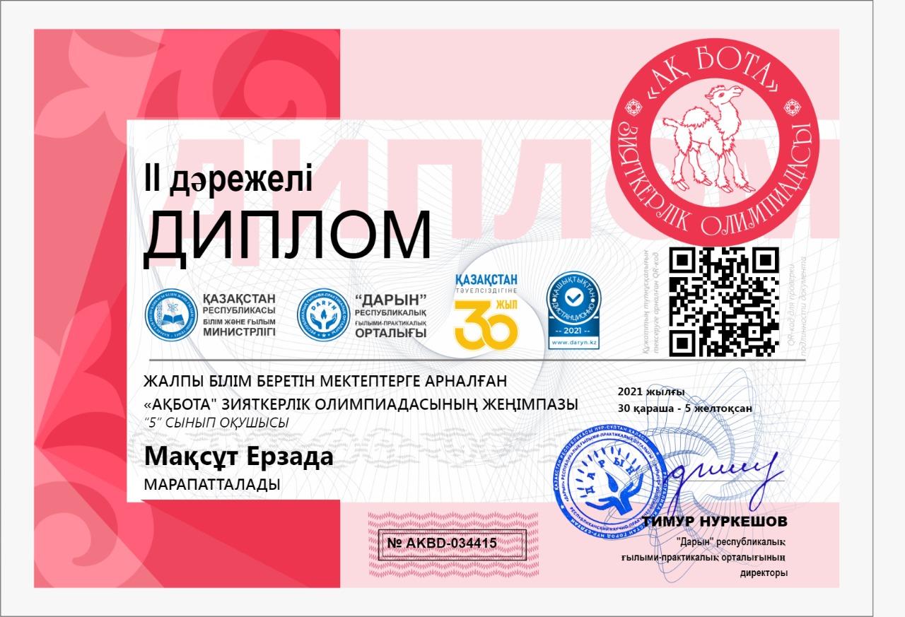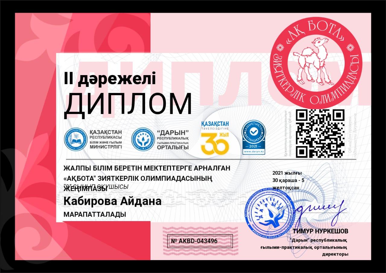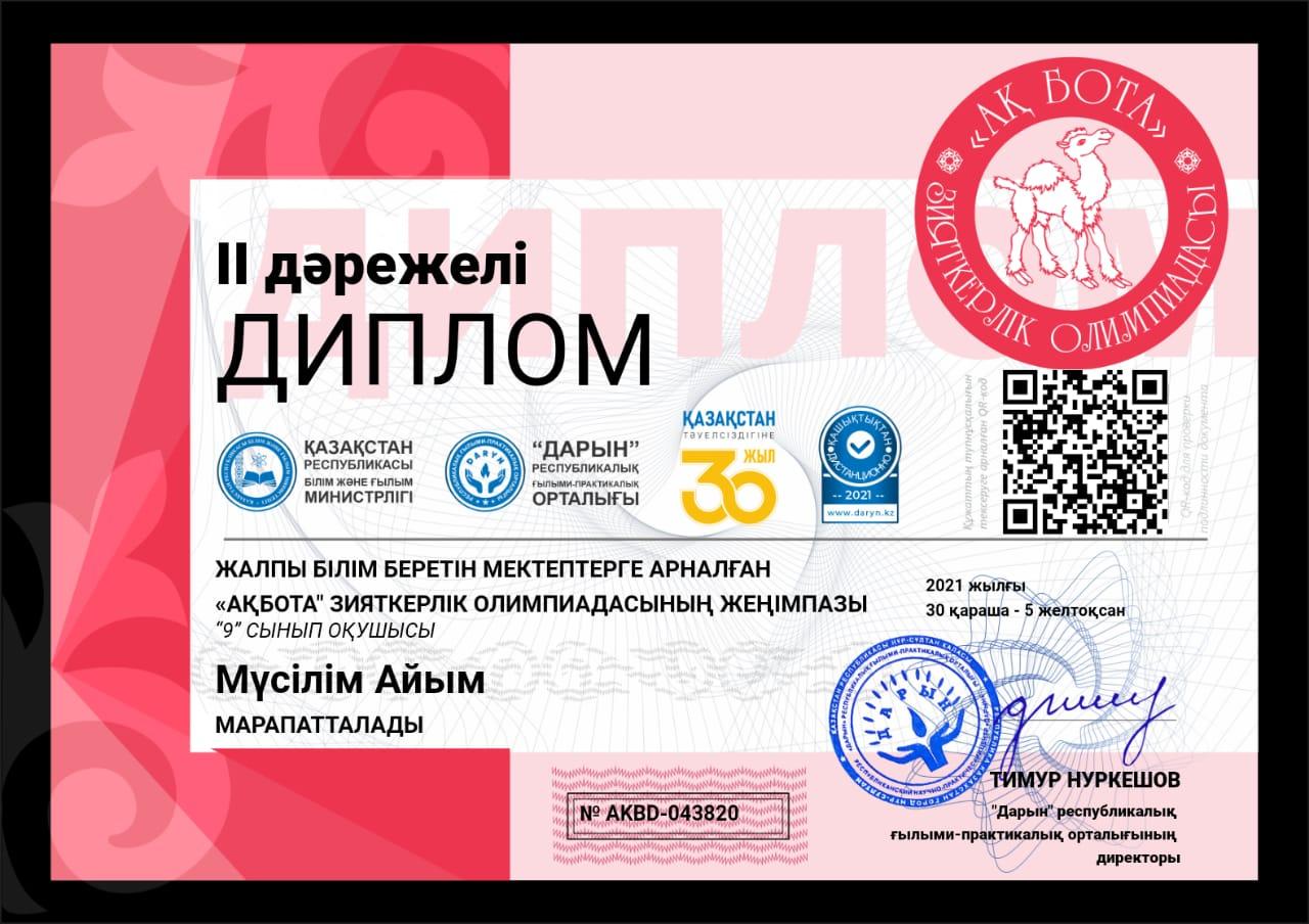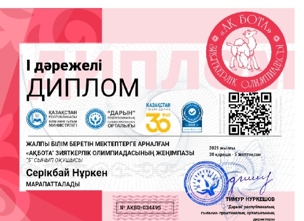 "Дарын" Республикалық ғылыми-практикалық орталығы ұйымдастырған "Ақбота" зияткерлік олимпиадасына 5-11 сынып оқушылары қатысып, жүлделі орындарға ие болды. Жетекшілері мектебіміздің математика пәні мұғалімдері