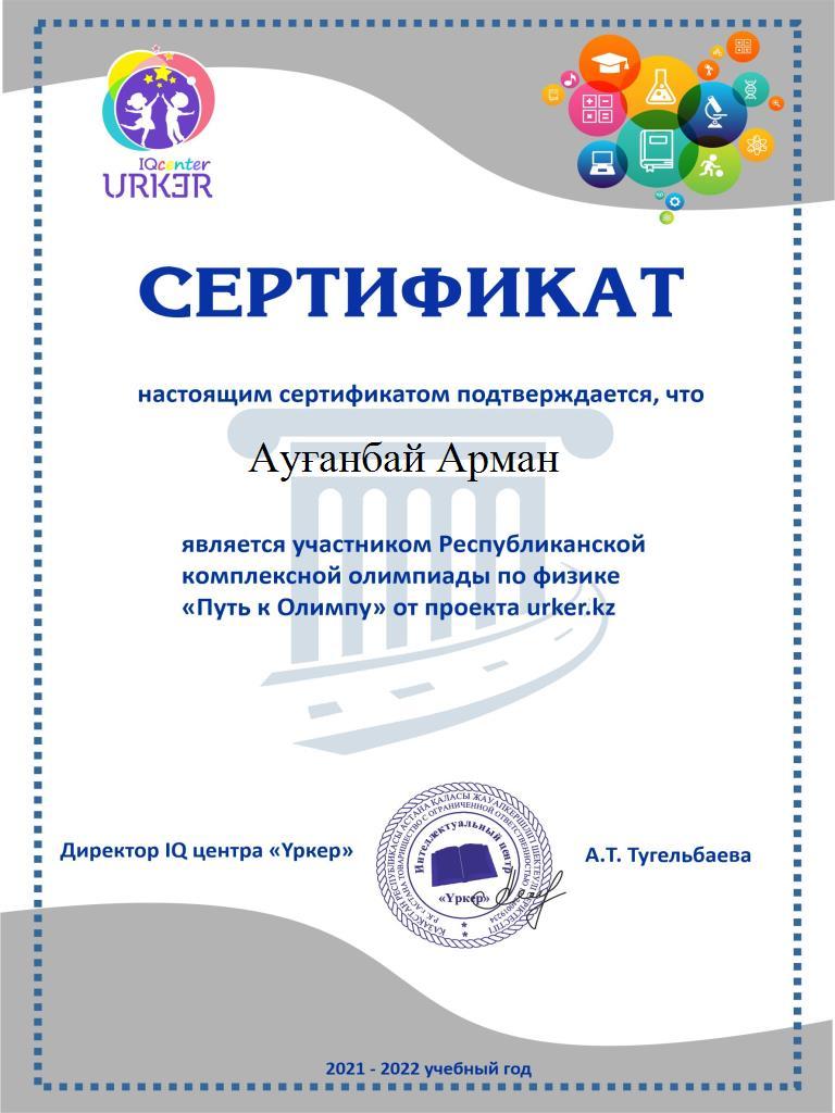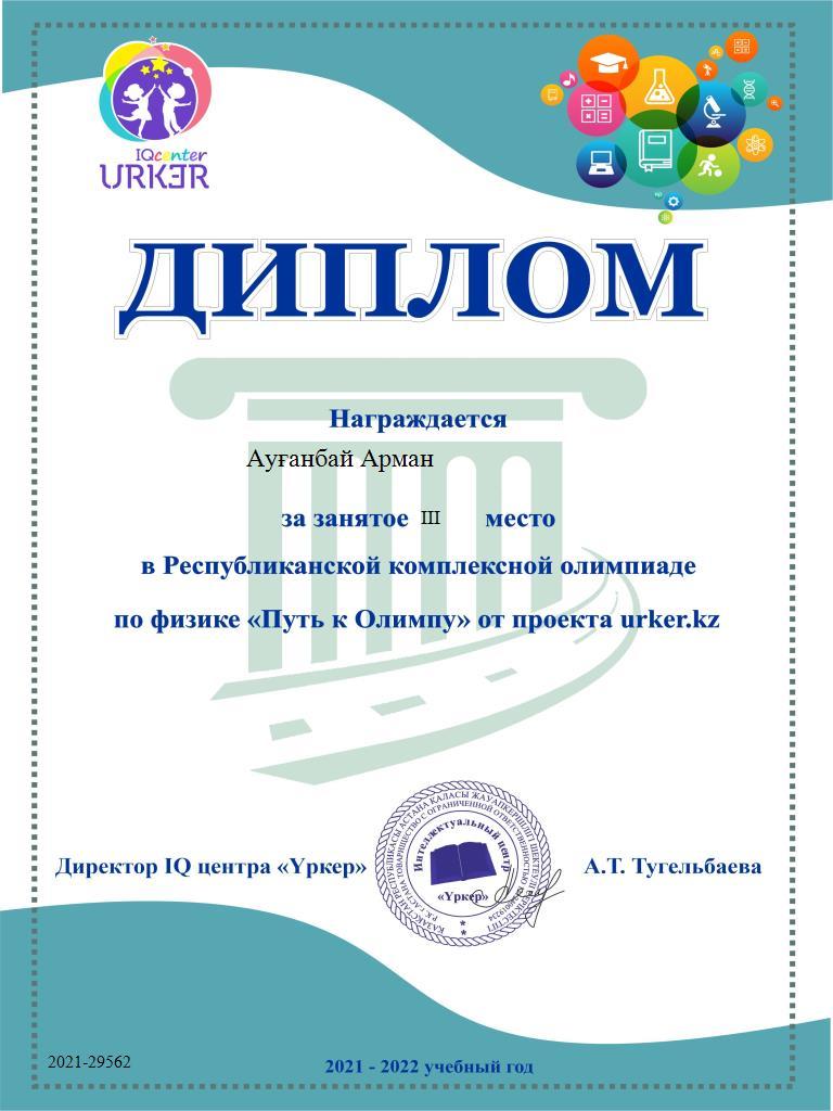 №164 Жалпы білім беретін мектеп » Ақпарат » Республикалық URKER .KZ ұйымдастырған "Путь к Олимпу" олимпиадасына физика пәні бойынша 8 "Ә" сынып оқушысы Ауғанбай Арман қатысып, ІІІ орынға ие болды. Жетекшісі, физика пәні мұғалімі А.Ділдан.