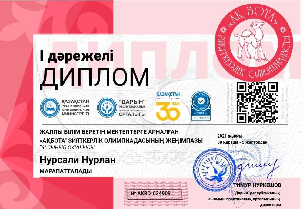 "Дарын" Республикалық ғылыми-практикалық орталығы ұйымдастырған "Ақбота" зияткерлік олимпиадасының І орын иегерлері 6 сынып оқушылары Жақсылықбай Данияр мен Нұрсали Нұрлан, 7 сынып оқушысы Садуақас Гүлмира, пән мұғалімі А.Хурметхан.