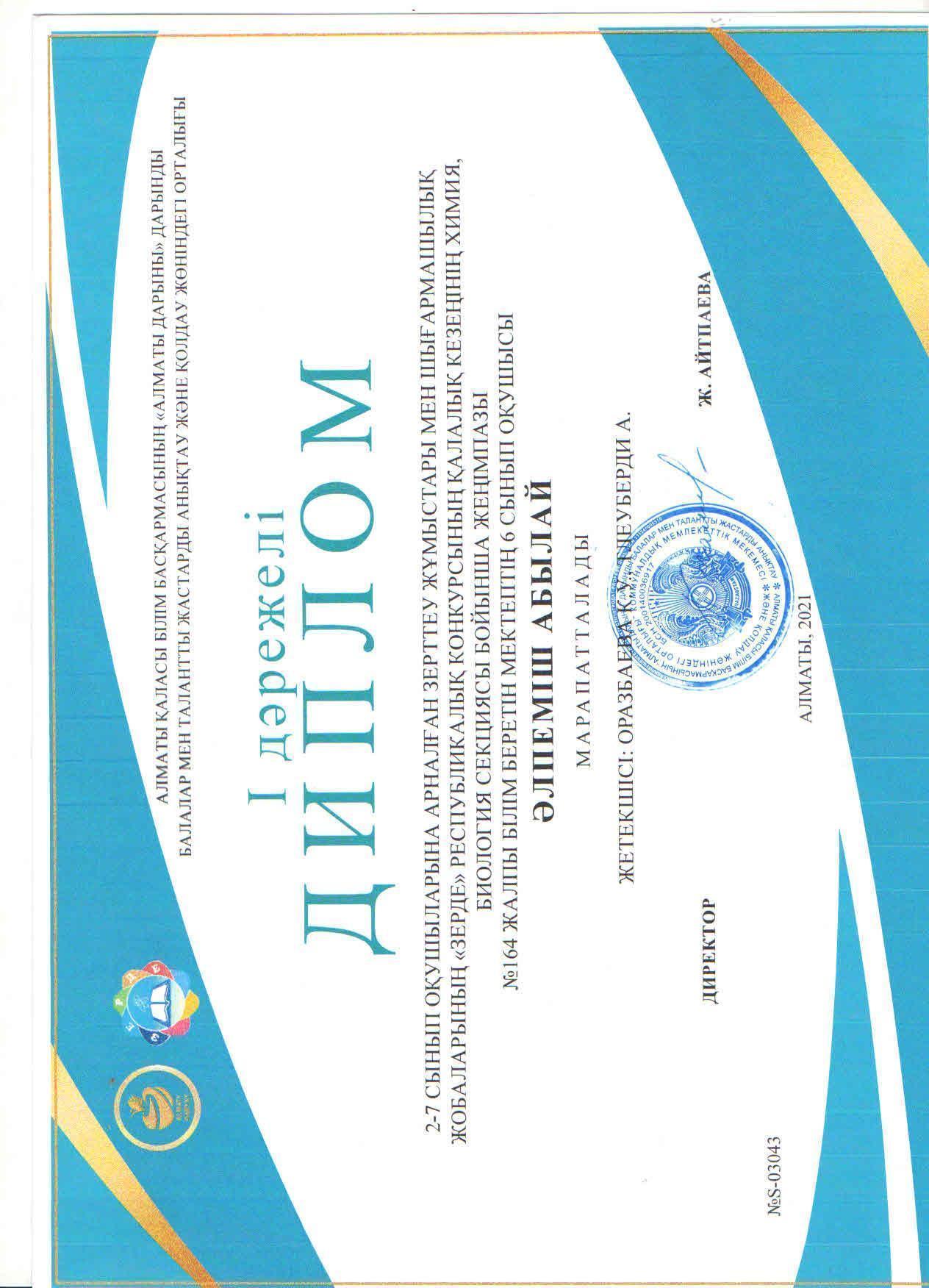 "Зерде" қалалық 2-7 сынып оқушыларының зерттеу жұмыстары мен шығармашылық жобаларының биология, химия секциясы бойынша 6 сынып оқушылары Әлпеміш Абылай мен Қыдырбек Алина командалық жұмыс қорғап, І дәрежелі диплом иегері болды.