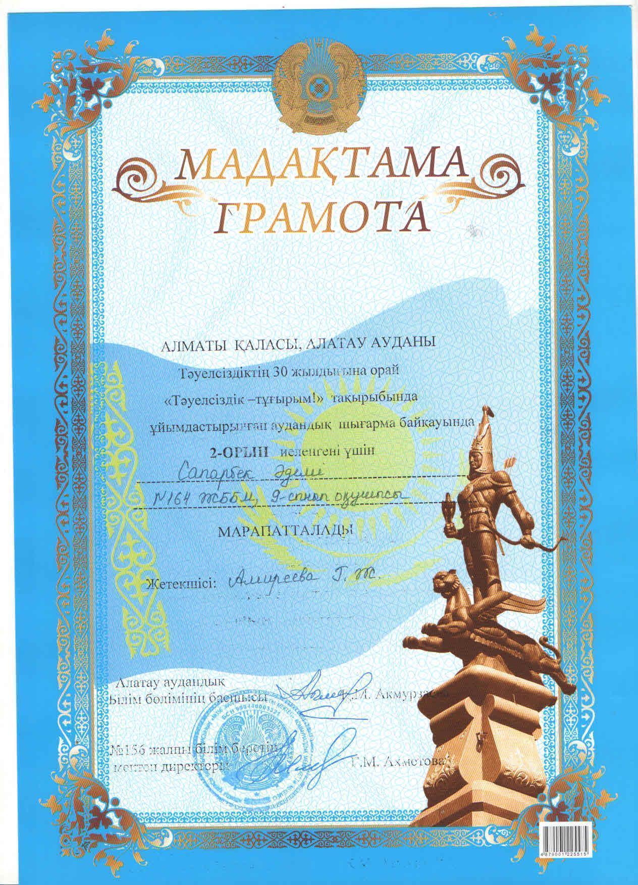 №164 Жалпы білім беретін мектеп » Ақпарат » Тәуелсіздіктің 30 жылдығына орай ұйымдастырылған "Тәуелсіздік -тұғырым" аттыаудандық шығарма байқауға 9 "Б" сынып оқушысы Сапарбек Әдемі қатысып, жүлделі ІІ орынға ие болды. Жетекшісі қазақ тілі мен әдебиеті пәні мұғалімі Г.Амиреева.