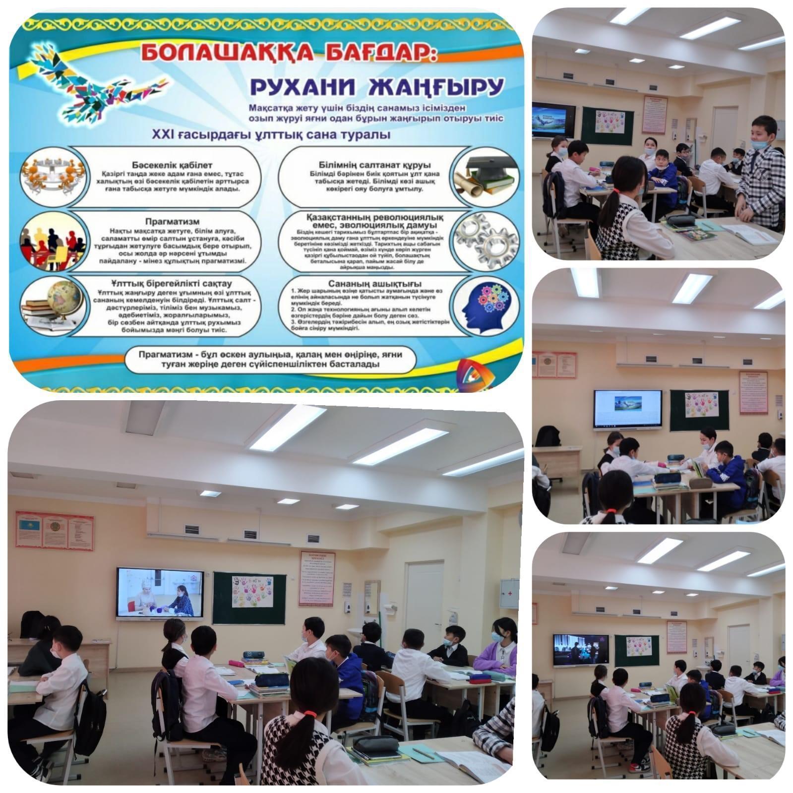 «Рухани жаңғыру» бағдарламасын жүзеге асыру жұмыстары аясында мектеп оқушылары үшін «Болашаққа бағдар» видеофильмінің көрсетілімі өтті. Мақсаты: «Рухани жаңғыру» бағдарламасы арқылы оқушыларды әлеуметтік маңызы бар іс-әрекеттерге машықтандыру.