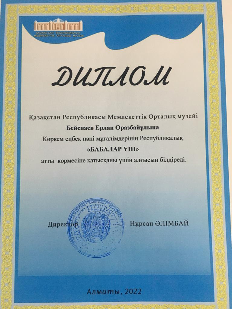 10 ақпан 2022 0 1 2 3 4 5 Мектебіміздің көркем еңбек пәні мұғалімі Е.О. Бейспаев Республикалық «Бабалар үні» атты көрмесіне қатысып алғыс хатпен марапатталды. Осы беттің QR-коды:QR-код этой страницы: