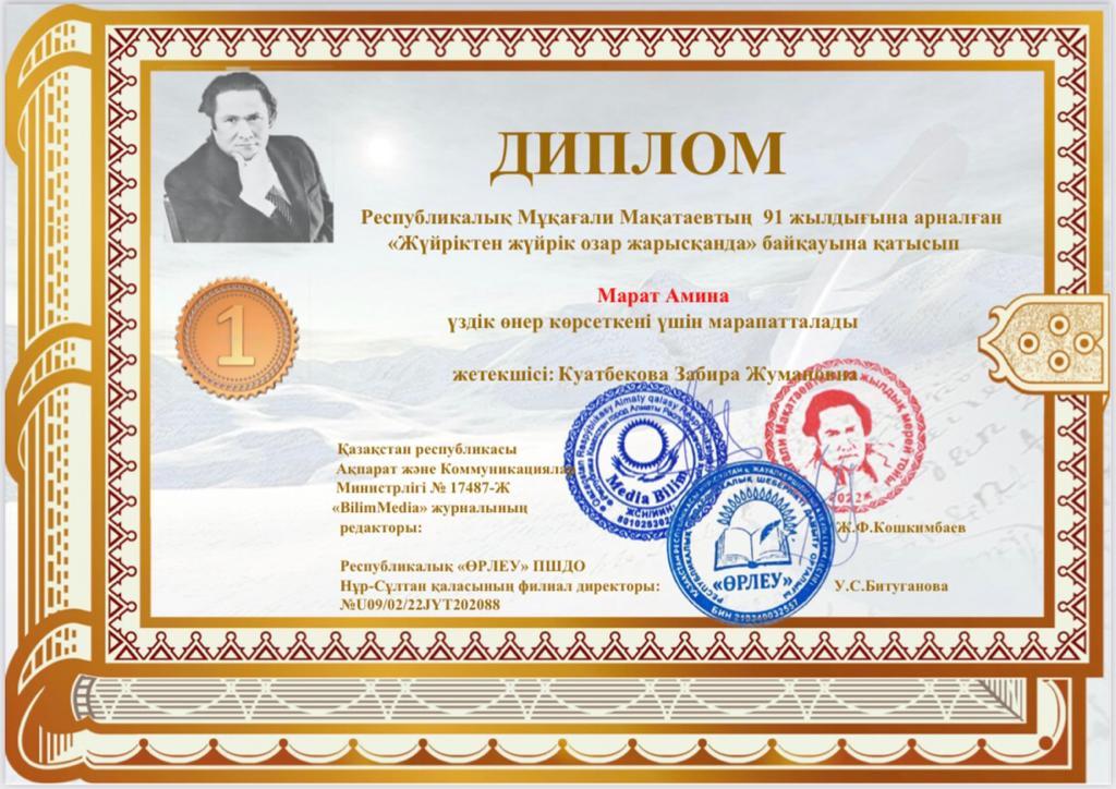 Республикалық "Өрлеу" ПШДО ұйымдастырған Мұқағали Мақатаевтың 91 жылдығына арналған "Жүйріктен жүйрік озар жарысқанда" байқауына қатысып, үздік өнер көрсеткені үшін 2 "Б" сынып оқушысы Марат Амина Дипломмен марапатталды