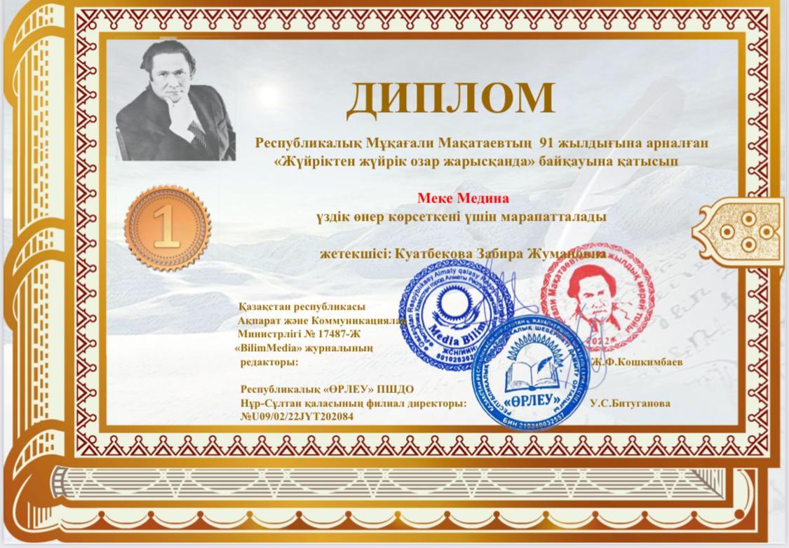 Республикалық "Өрлеу" ПШДО ұйымдастырған Мұқағали Мақатаевтың 91 жылдығына арналған "Жүйріктен жүйрік озар жарысқанда" байқауына қатысып, үздік өнер көрсеткені үшін 2 "Б" сынып оқушысы Меке Медина Дипломмен марапатталды