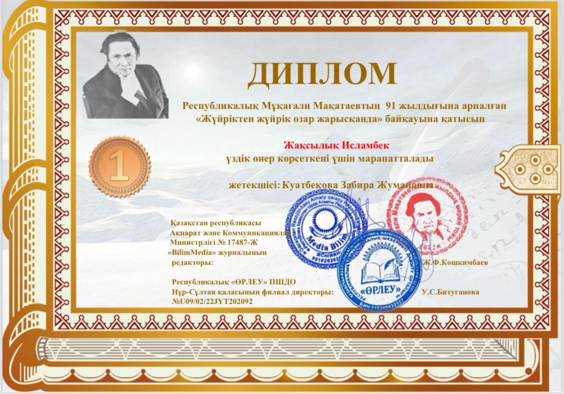 Республикалық "Өрлеу" ПШДО ұйымдастырған Мұқағали Мақатаевтың 91 жылдығына арналған "Жүйріктен жүйрік озар жарысқанда" байқауына қатысып, үздік өнер көрсеткені үшін 2 "Б" сынып оқушысы Жақсылық Исламбек Дипломмен марапатталды