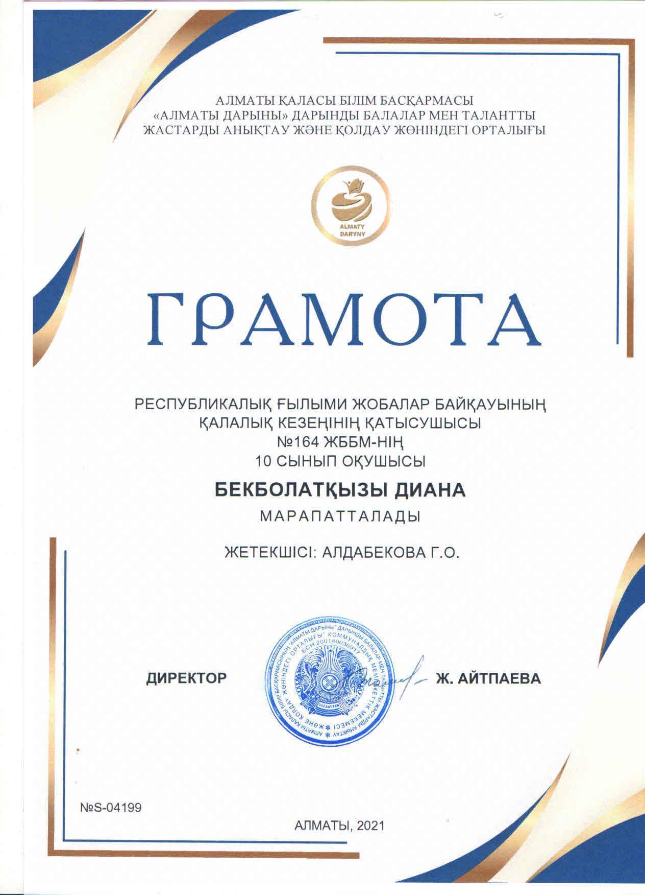№164 Жалпы білім беретін мектеп » Ақпарат » Респбуликалық ғылыми жобалар байқауының қалалық кезеңіне Әдебиет бағыты бойынша 11 "Ә" сынып оқушысы Бекболатқызы Диана қатысып, Грамотаға ие болды. Жетекшілері қазақ тілі мен әдебиеті пәні мұғалімдері Б.Кусаинова мен Г.Алдабекова