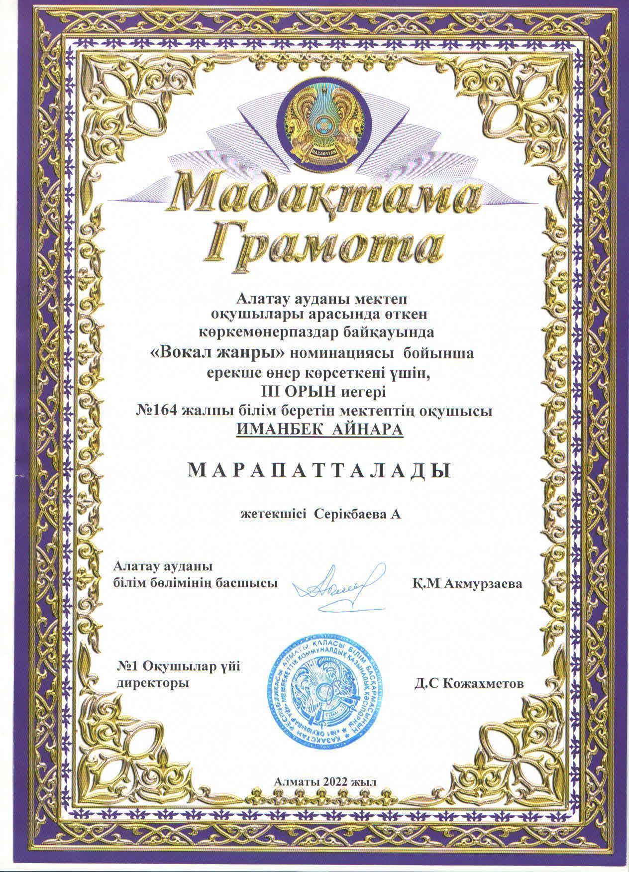 №164 Жалпы білім беретін мектеп » Ақпарат » Алатау ауданы мектеп оқушылары арасында өткен көркемөнерпаздар байқауына "Вокал" жанры бойынша ІІІ орын иегері мектепалды даярлық тобының оқушысы Иманбек Айнара, жетекшісі музыка пәні мұғалімі А.Серикбаева