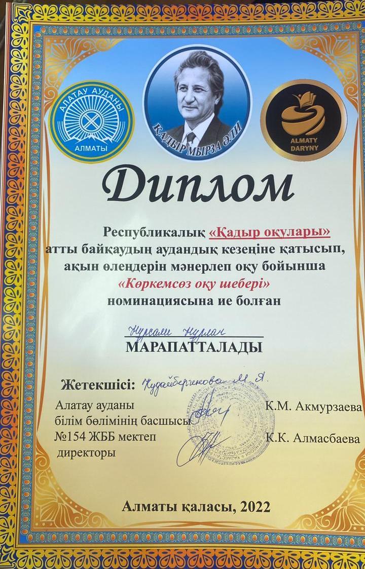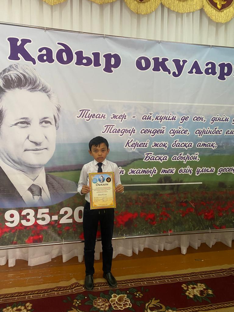 Республикалық "Қадыр оқулары" байқауының аудандық кезеңінде ақын өлеңдерін мәнерлеп оқу бойынша 6 "Ә" сынып оқушысы Нурсали Нұрлан қатысып, "Көркемсөз оқу шебері" номинациясына ие болды.