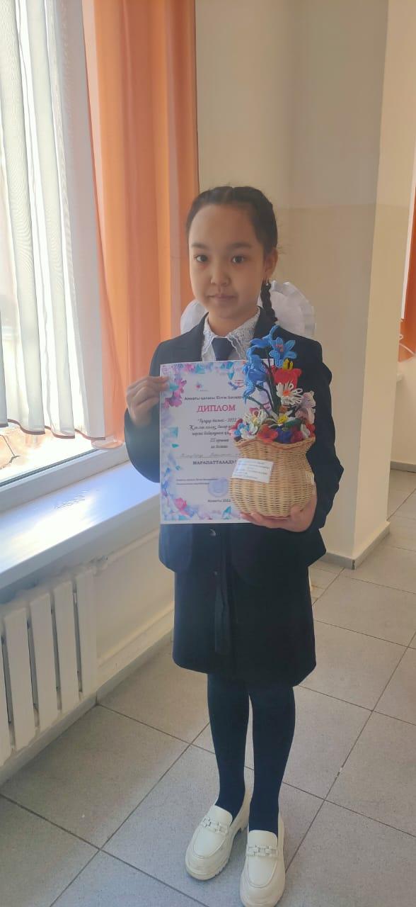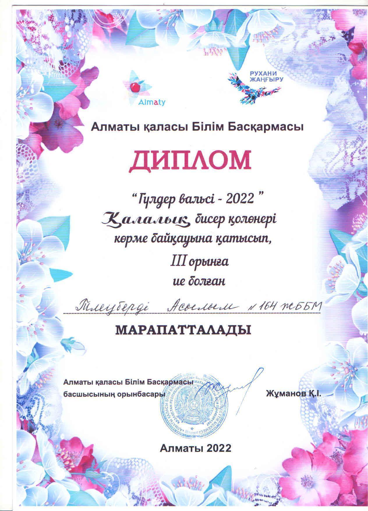 Алматы қаласы Білім басқармасы ұйымдастырған "Гүлдер вальсі-2022" атты Қалалық бисер қолөнері көрме байқауына 4"Б" сынып оқушысы Тілеуберді Асылым қатысып, жүлделі ІІІ орынға ие болды.Жетекшісі, технология пәні мұғалімі Р.Дюсебекова.