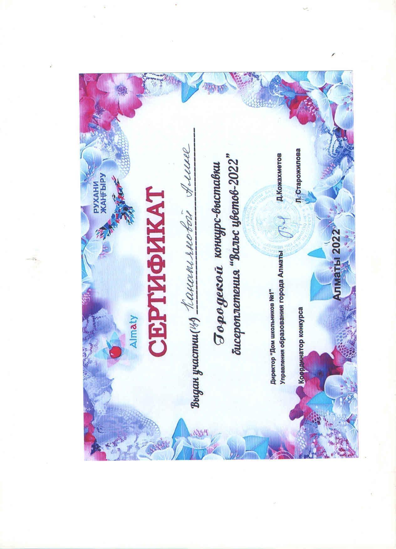 "Гүлдер вальсі-2022" атты Қалалық бисер қолөнері көрме байқауына 6 "Д" сынып оқушысы Канапьянова Алина қатысқаны үшін сертификатқа ие болды. Жетекшісі, технология пәні мұғаілімі Р.Дюсебекова.