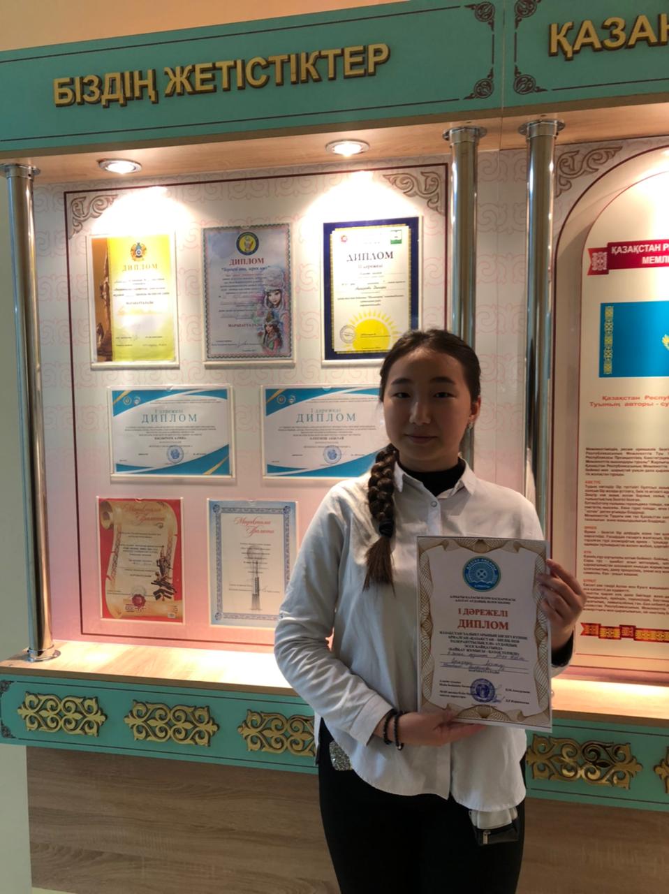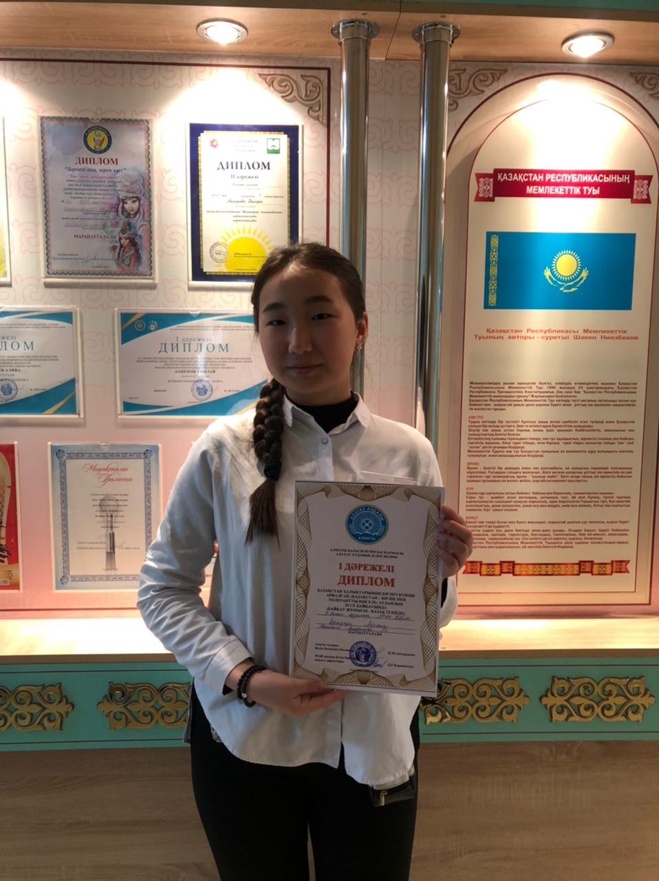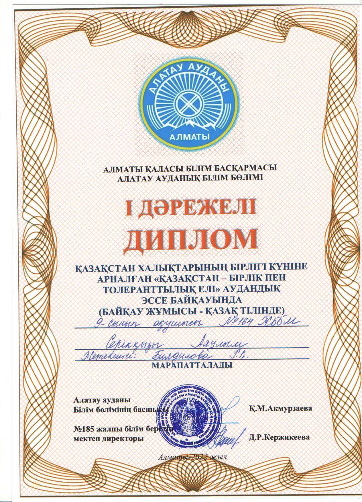 Қазақстан халықтарының бірлігі күніне орай ұйымдастырылған "ҚАЗАҚСТАН-БІРЛІК ПЕН ТОЛЕРАНТТЫЛЫҚ ЕЛІ" атты аудандық эссе байқауының 1 орын иегері 9 "А" сынып оқушысы Серікқызы Аяулым, жетекшісі қазақ тілі мен әдебиеті пәні мұғалімі Р.Биядилова