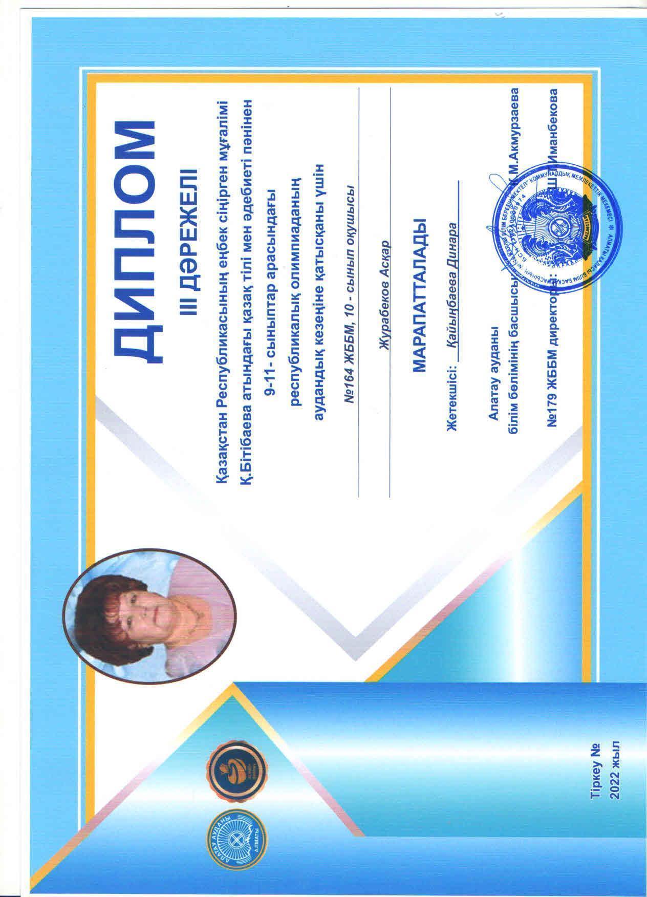 Қ.Бітібаева атындағы қазақ тілі мен әдебиеті пәнінен 9-11 сыныптар арасындағы республикалық олимпиаданың аудандық кезеңінің ІІІ орын иегері 10 "Ә" сынып оқушысы А.Журабеков, жетекшісі қазақ тілі мен әдебиеті пәні мұғалімі Д.Қайыңбаева