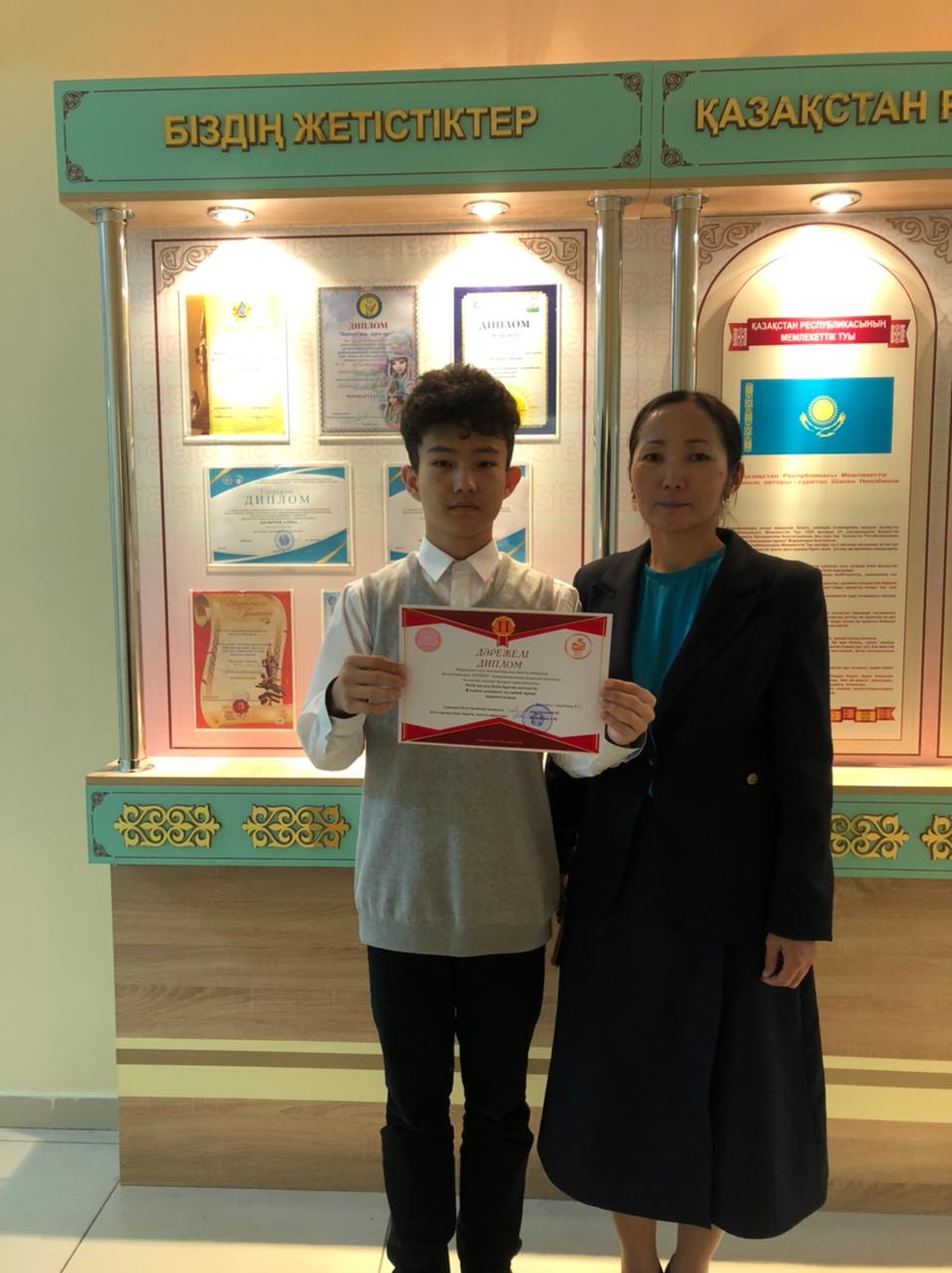 Жаратылыстану-математикалық бағыты бойынша республикалық "ЮНИОР" олимпиадасының аудандық кезеңінде биология пәнінен ІІ орын алған 8 "Ә" сынып оқушысы Ауғанбай Арман, жетекшісі биология пәні мұғалімі Қ.Оразбаева.