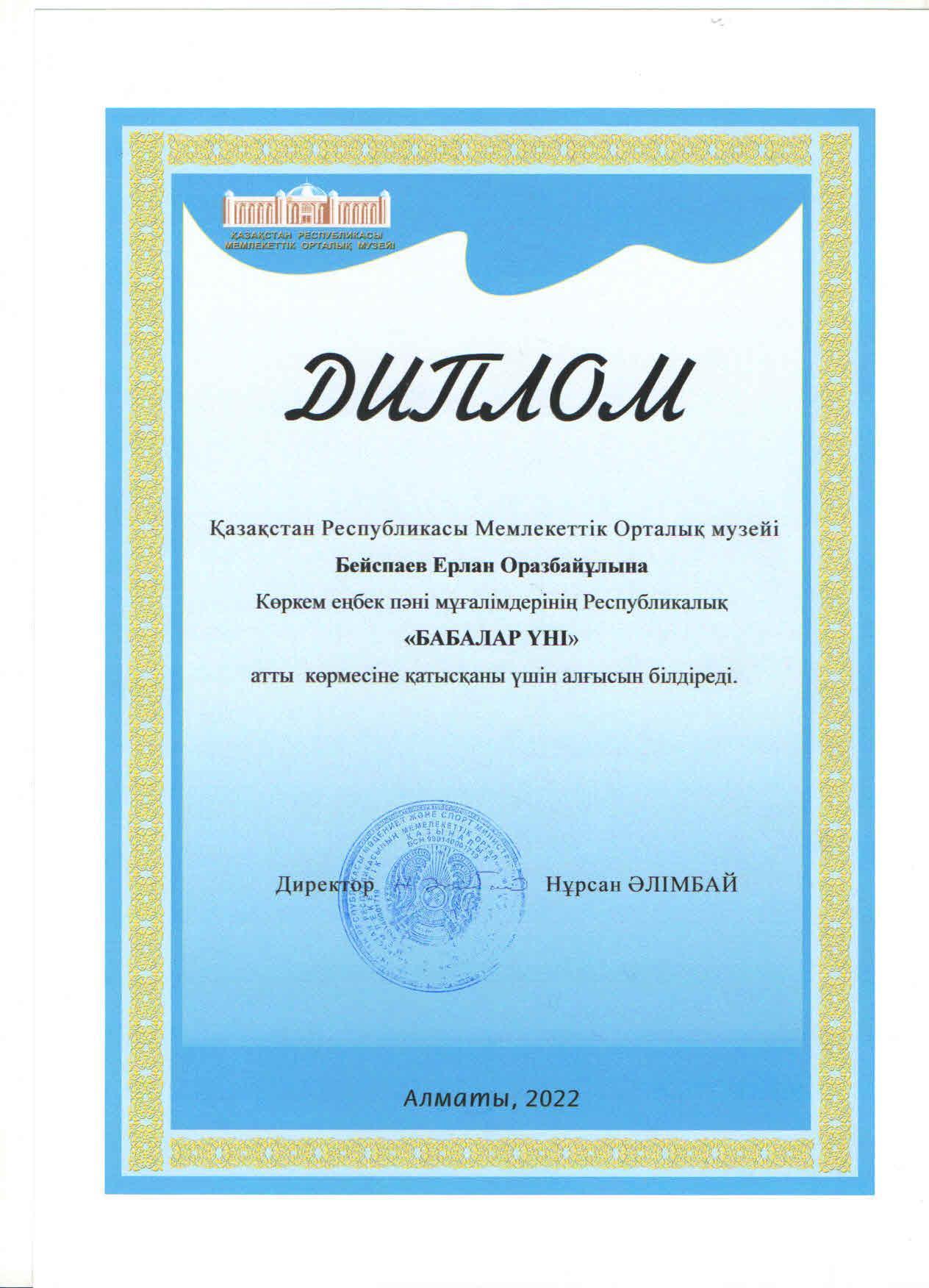 ҚР Мемлекеттік орталық музейі ұйымдастырған "Бабалар үні" атты көркем еңбек пәні мұғалімдерінің Республикалық көрмесіне қатысқаны үшін Е.Бейспаев Дипломмен марапатталды.