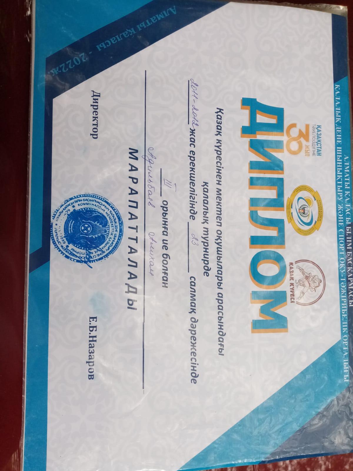 Қалалық дене шынықтыру және спорт оқу -тәжірибелік орталығы ұйымдастырған Қазақ күресінің қалалық турниніне 3 "Г" сынып оқушысы Адильбаев Алихан қатысып, жүлделі ІІІ орынға ие болды. Жетекшісі дене шынықтыру пәні мұғалімі Р.Дадабаев.