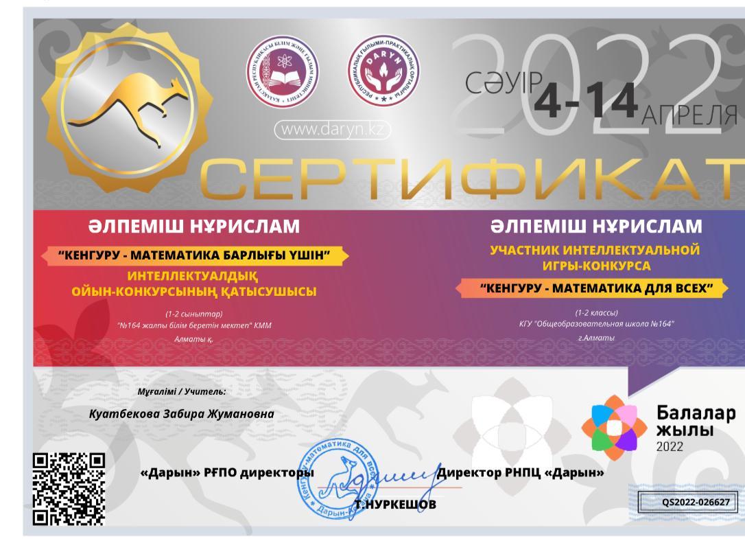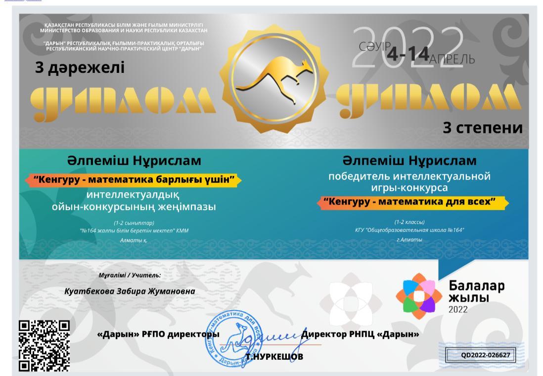 "Дарын" Республикалық ғылыми-практикалық орталығы ұйымдастырған "КЕНГУРУ-математика барлығы үшін" интеллектуалдық байқауының ІІІ орын иегері 2 "Б" сынып оқушысы Әлпеміш Нұрислам, жетекшісі бастауыш сынып мұғалімі З.Куатбекова