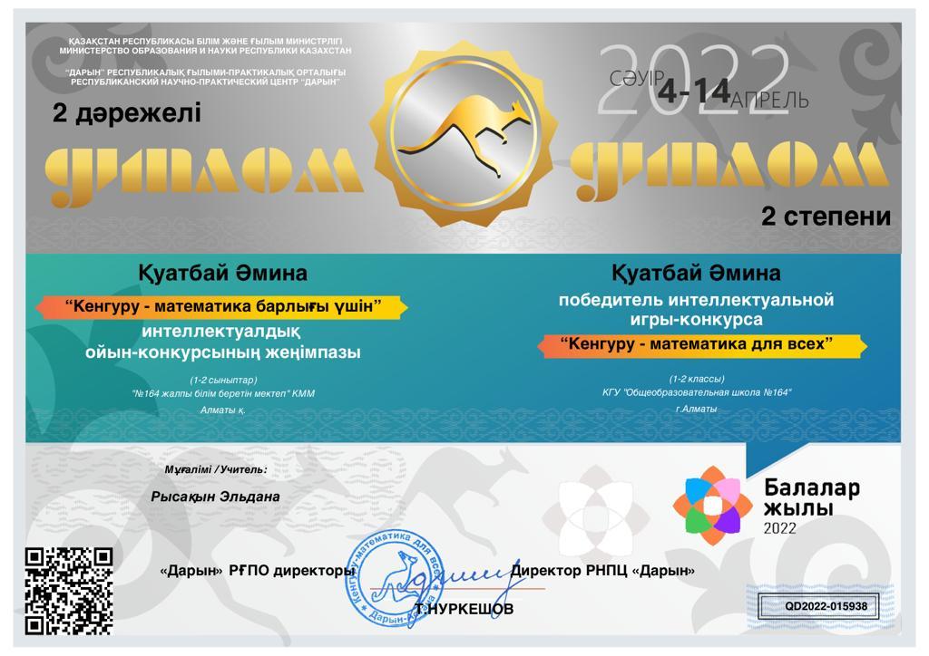 "КЕНГУРУ-математика барлығы үшін" интеллектуалдық байқауының ІІ орын иегерлері 2"Ә" сынып оқушылары А.Асқар, Ә.Серіктес, Ә.Қуатбай, Н.Кендебай, Е.Наурызбай, Д.Сарқытбай, А.Шахархан, Н.Тлебалдина, С.Санчизова, Ж.Султанова.