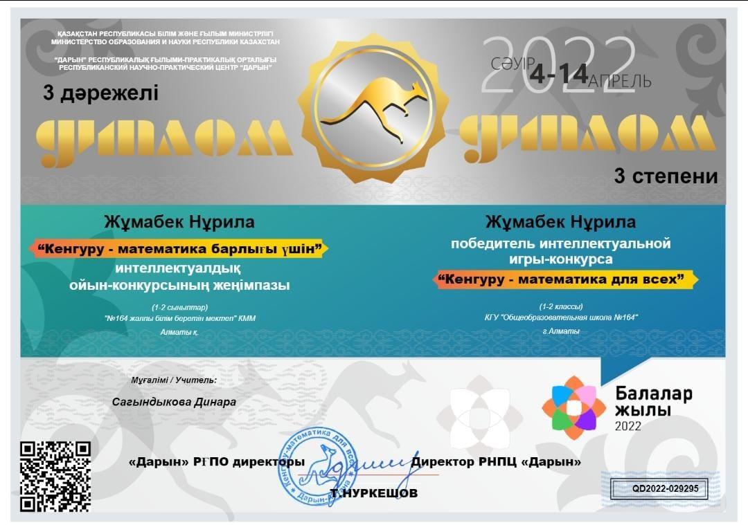 №164 Жалпы білім беретін мектеп » Ақпарат » "КЕНГУРУ-математика барлығы үшін" интеллектуалдық байқауының ІІІ орын иегері 2"А" сынып оқушысы Жұмабек Нұрила, жетекшісі бастауыш сынып мұғалімі Д.Сағындықова