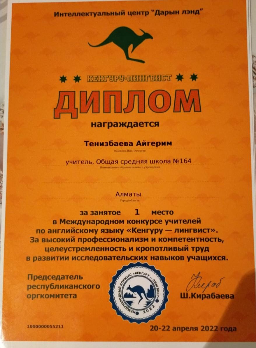 №164 Жалпы білім беретін мектеп » Ақпарат » "Дарын лэнд" орталығының ағылшын тілі пәні мұғалімдеріне арналған Халықаралық "Кенгуру -Лингвист" байқауына ағылшын тілі пәні мұғалімі А.Тенизбаева қатысып, І орынға ие болды.