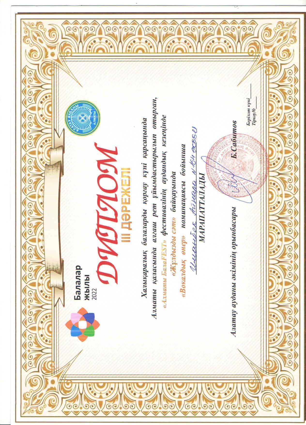 №164 Жалпы білім беретін мектеп » Ақпарат » "Алматы БалаFEST" фестивалінің аудандық кезеңінде "Жұлдызды сәт" байқауыны "Вокалдық өнер" номинациясы бойынша мектепалды даярлық тобының оқушысы А.Иманбек ІІІ дәрежелі диплом иегері болып, Алатау ауданы әкімінің Дипломымен марапатталды