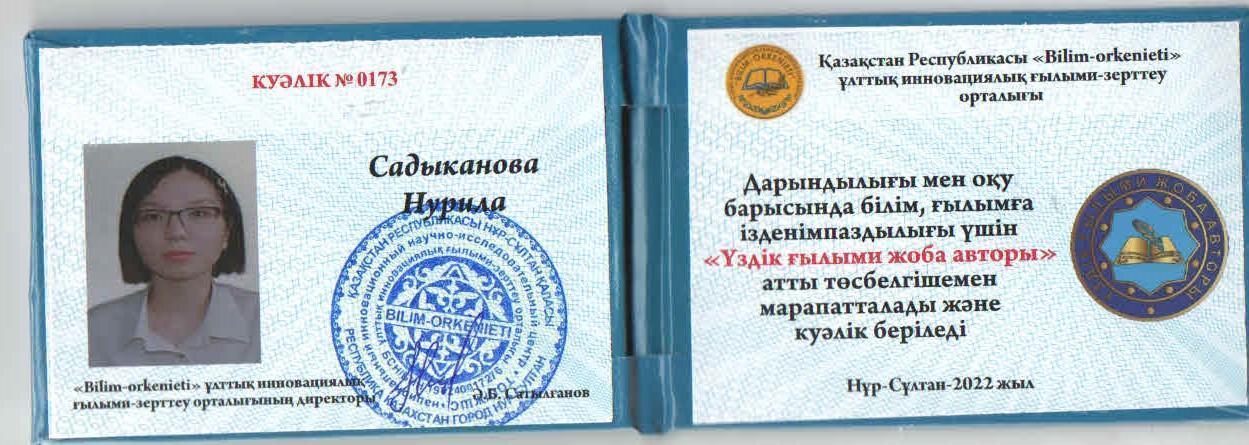 №164 Жалпы білім беретін мектеп » Ақпарат » "Ұлағатты ұстаз-Дарынды шәкірт" атты республикалық ғылыми жобалар байқауына 10 "Ә" сынып оқушысы Н.Садыканованың зерттеу жұмысы жинаққа шығып, І дәрежелі диплом және төсбелгі иегері атанды.
