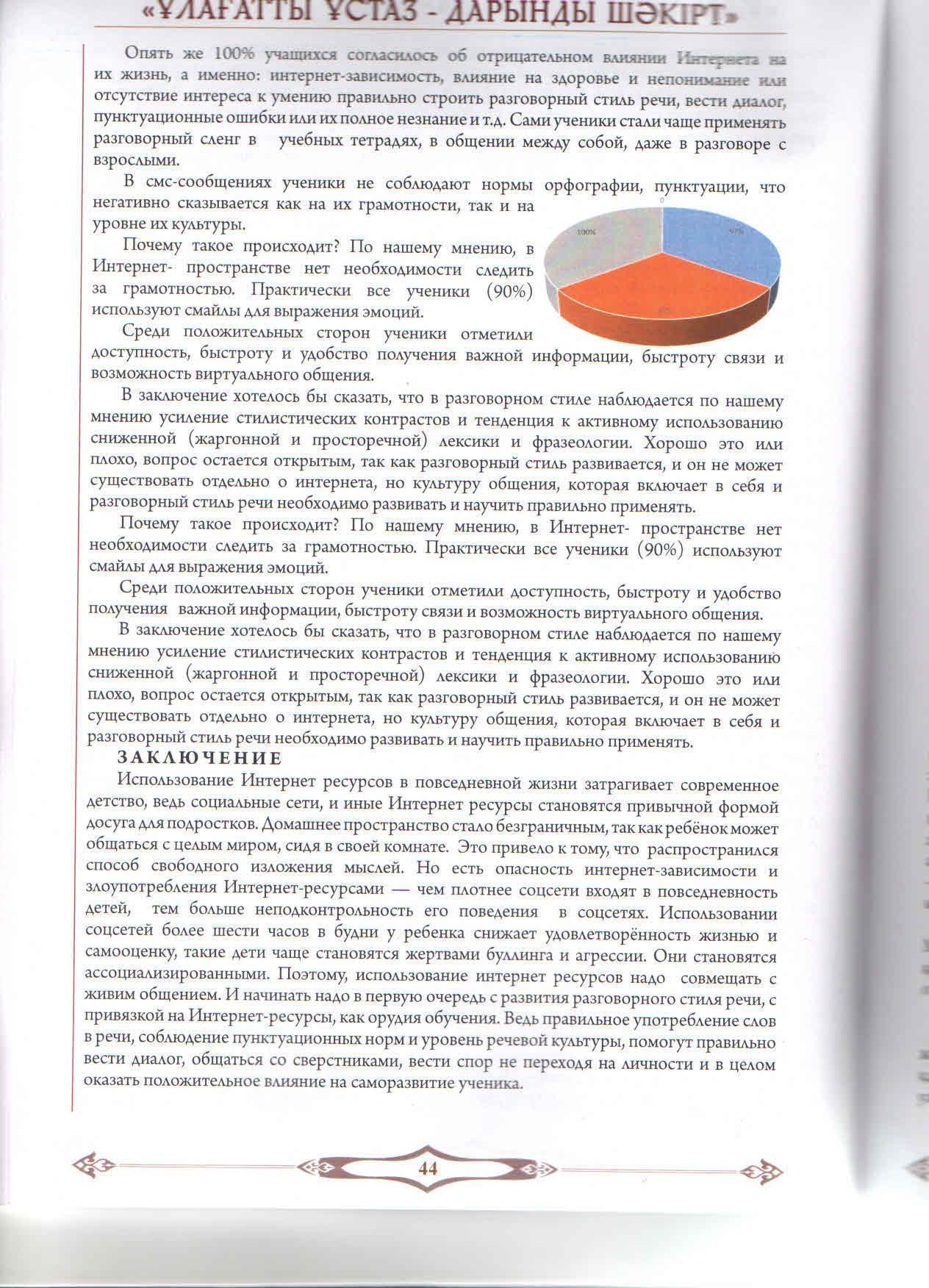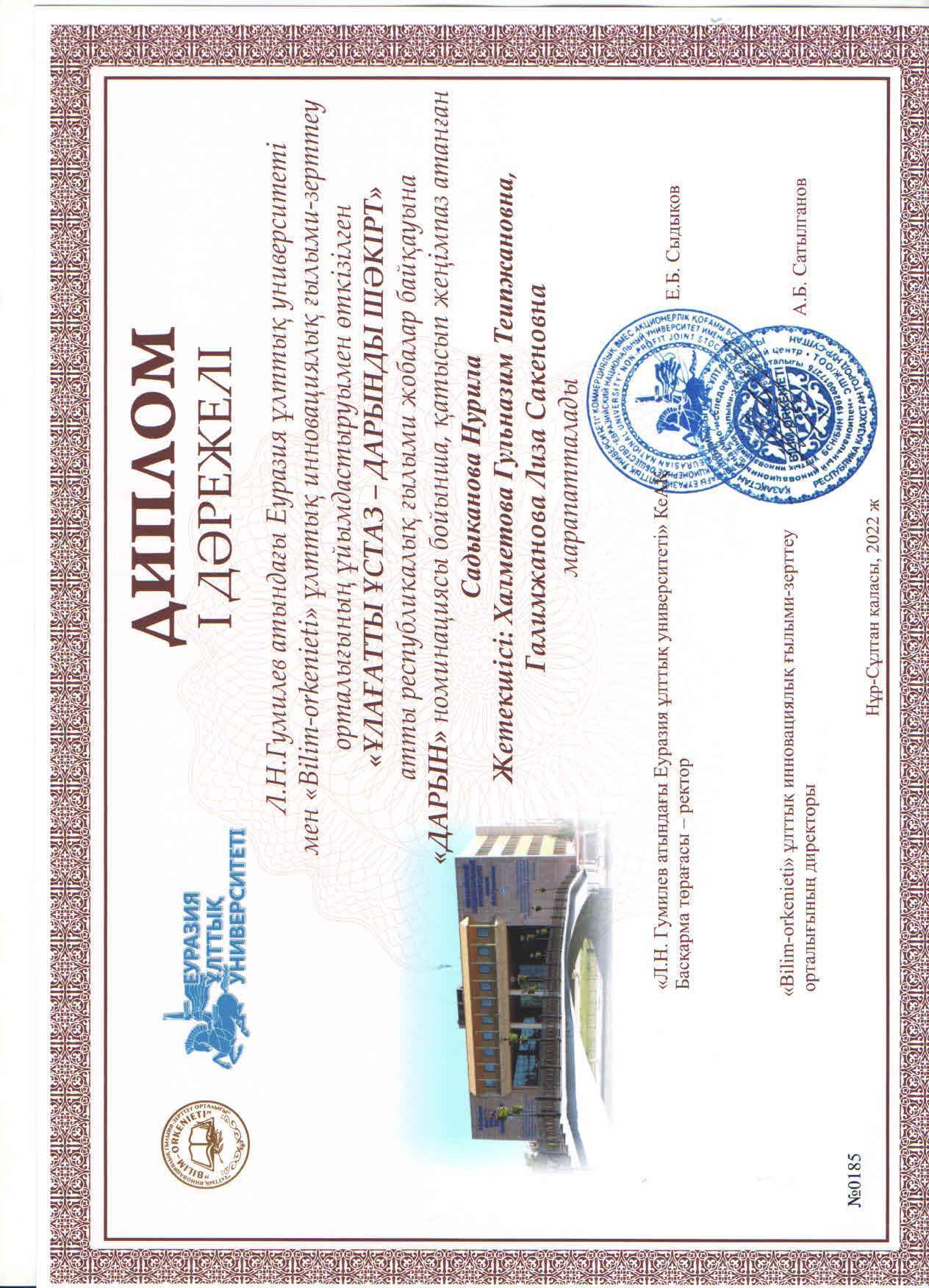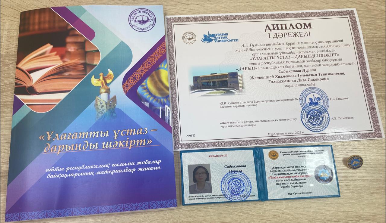 "Ұлағатты ұстаз-Дарынды шәкірт" атты республикалық ғылыми жобалар байқауына 10 "Ә" сынып оқушысы Н.Садыканованың зерттеу жұмысы жинаққа шығып, І дәрежелі диплом және төсбелгі иегері атанды.