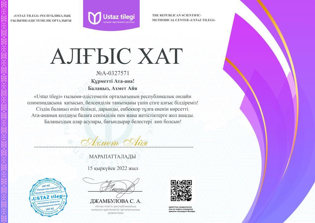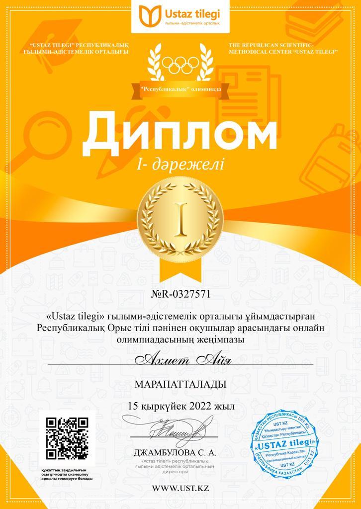 "USTAZ TILEGI" Республикалық ғылыми-әдістемелік орталығы ұйымдастырған орыс тілі пәнінен онлайн олимпиадасының І дәрежелі диплом иегері 3 "Б" сынып оқушысы Ахмет Айя, жетекшісі орыс тілі мен әдебиеті пәні мұғалімі А.Бидахметова.