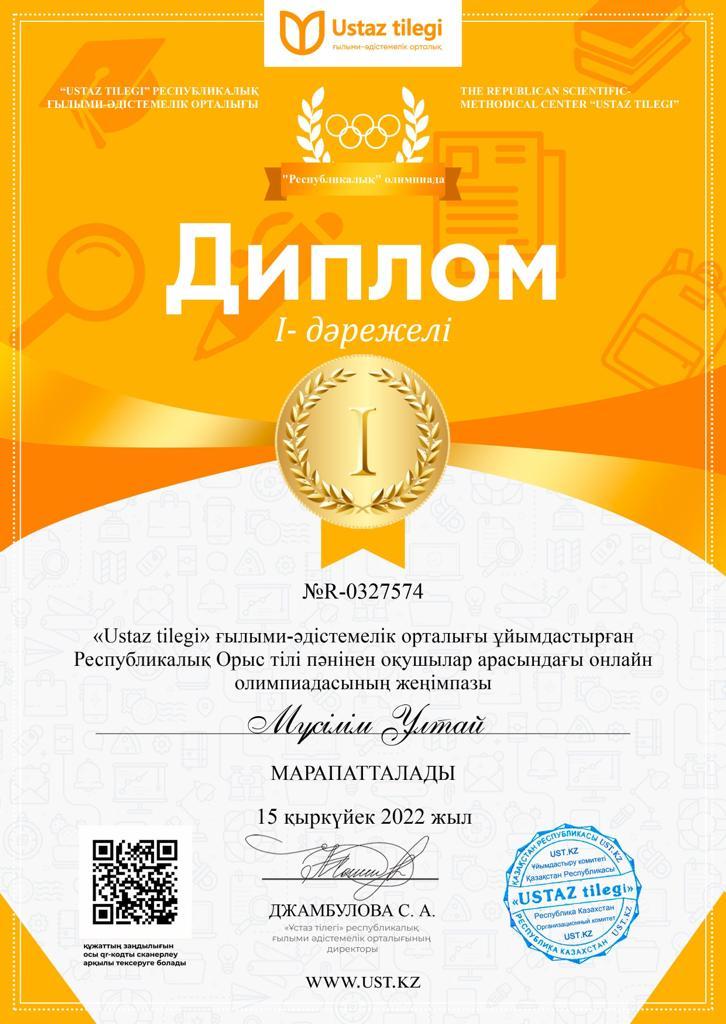 "USTAZ TILEGI" Республикалық ғылыми-әдістемелік орталығы ұйымдастырған орыс тілі пәнінен онлайн олимпиадасының І дәрежелі диплом иегері 3 "Б" сынып оқушысы Мүсілім Ұлтай, жетекшісі орыс тілі мен әдебиеті пәні мұғалімі А.Бидахметова.