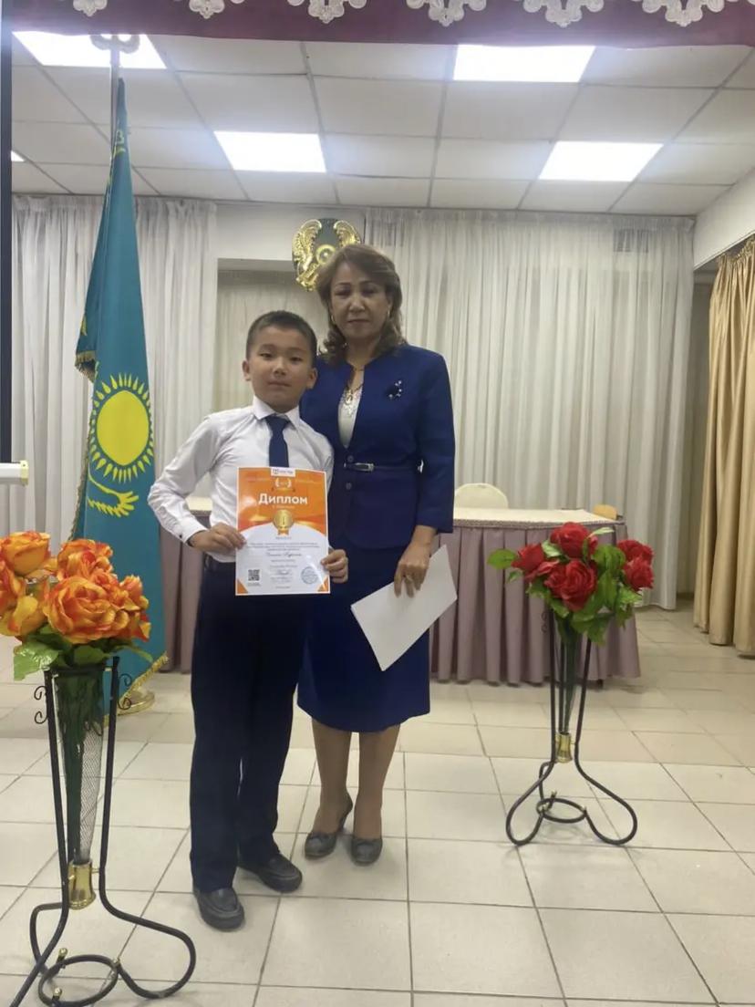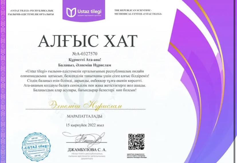 "USTAZ TILEGI" Республикалық ғылыми-әдістемелік орталығы ұйымдастырған орыс тілі пәнінен онлайн олимпиадасының І дәрежелі диплом иегері 3 "Б" сынып оқушысы Әлпеміш Нұрислам, жетекшісі орыс тілі мен әдебиеті пәні мұғалімі А.Бидахметова.