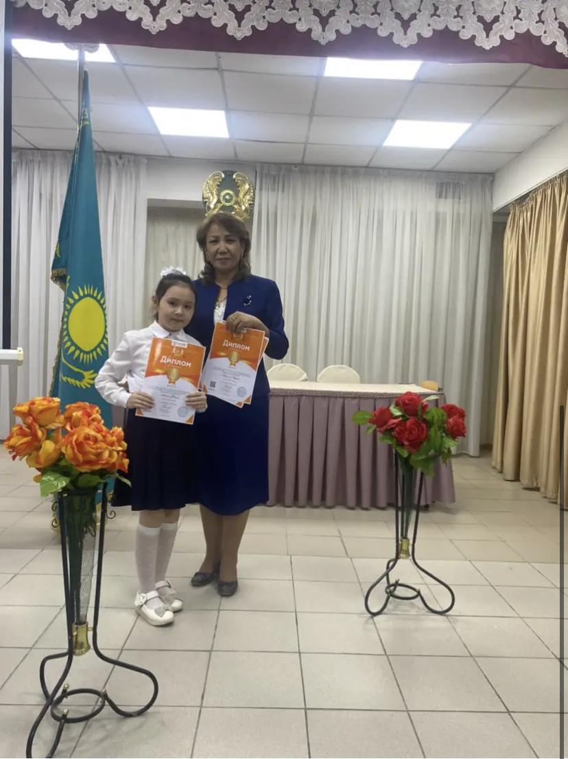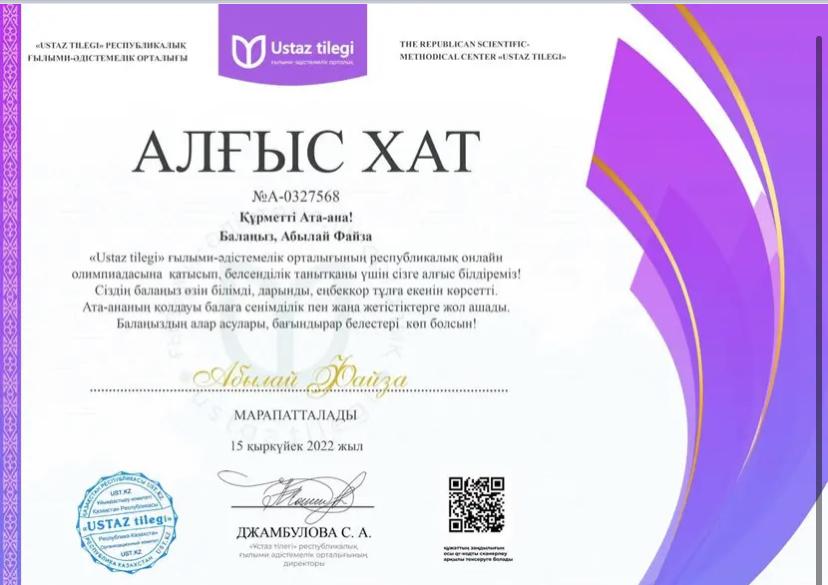"USTAZ TILEGI" Республикалық ғылыми-әдістемелік орталығы ұйымдастырған орыс тілі пәнінен онлайн олимпиадасының І дәрежелі диплом иегері 3 "Б" сынып оқушысы Абылай Файза, жетекшісі орыс тілі мен әдебиеті пәні мұғалімі А.Бидахметова.