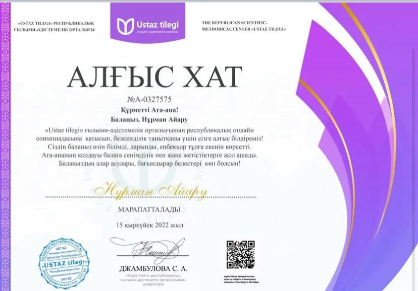 "USTAZ TILEGI" Республикалық ғылыми-әдістемелік орталығы ұйымдастырғанһ орыс тілі пәнінен онлайн олимпиадасының І дәрежелі диплом иегері 3 "Б" сынып оқушысы Нұрман Айару, жетекшісі орыс тілі мен әдебиеті пәні мұғалімі А.Бидахметова.