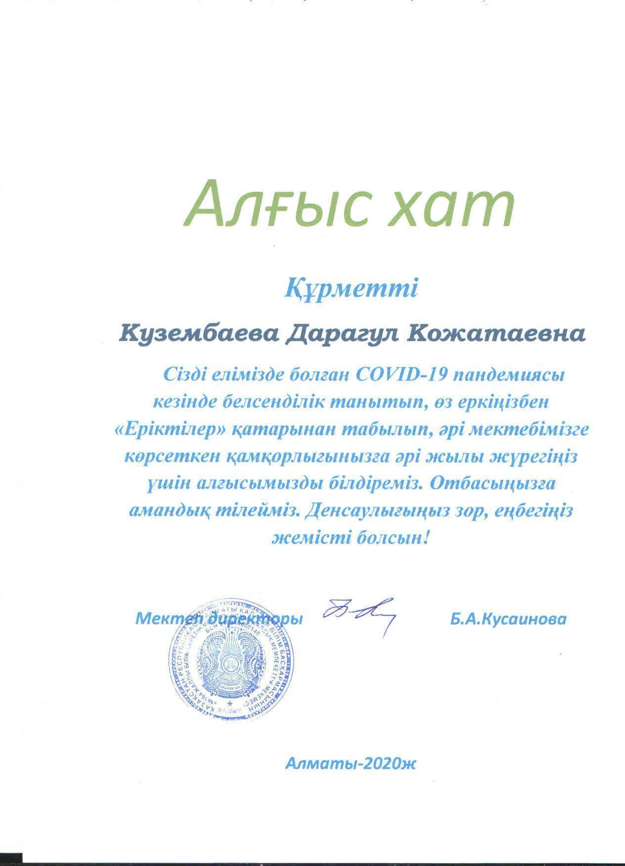 COVID-19 пандемиясы кезінде еріктілік танытып, әлеуметтік аз қамтылған оқушыларымыздың отбасына көмек көрсеткен ұстаздарымызға мектепішілік Алғыс хат берілді.