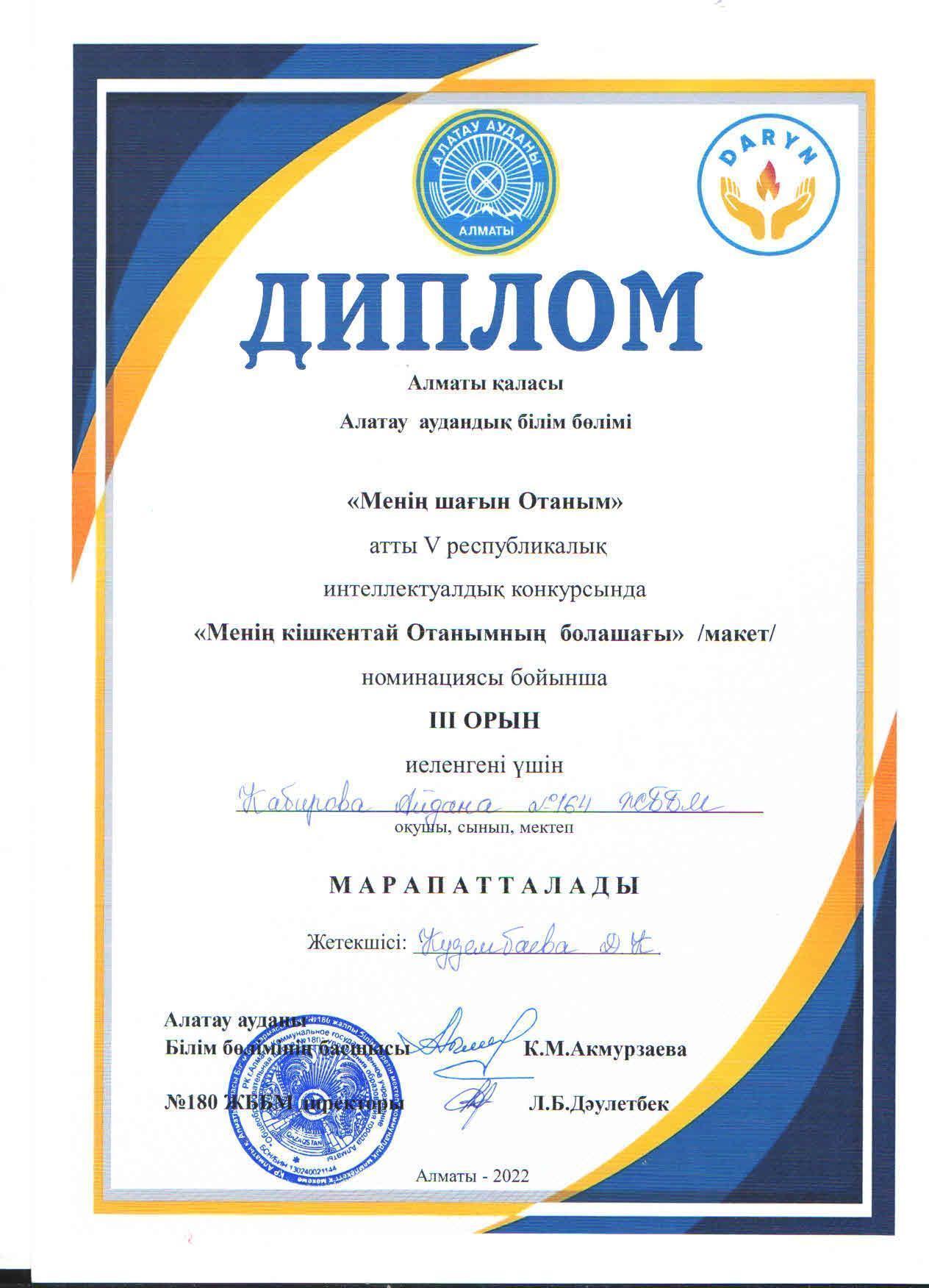 №164 Жалпы білім беретін мектеп » Ақпарат » Аудандық "Менің шағын Отаным" V республикалық интеллектуалдық конкурсына "Менің кішкентай Отанымның болашағы" макет номинациясы бойынша қатысып, ІІІ орын алған 10 "А"сынып оқушысы А.Кабирова жетекшісі тарих пәні мұғалімі Д.Кузембаева.