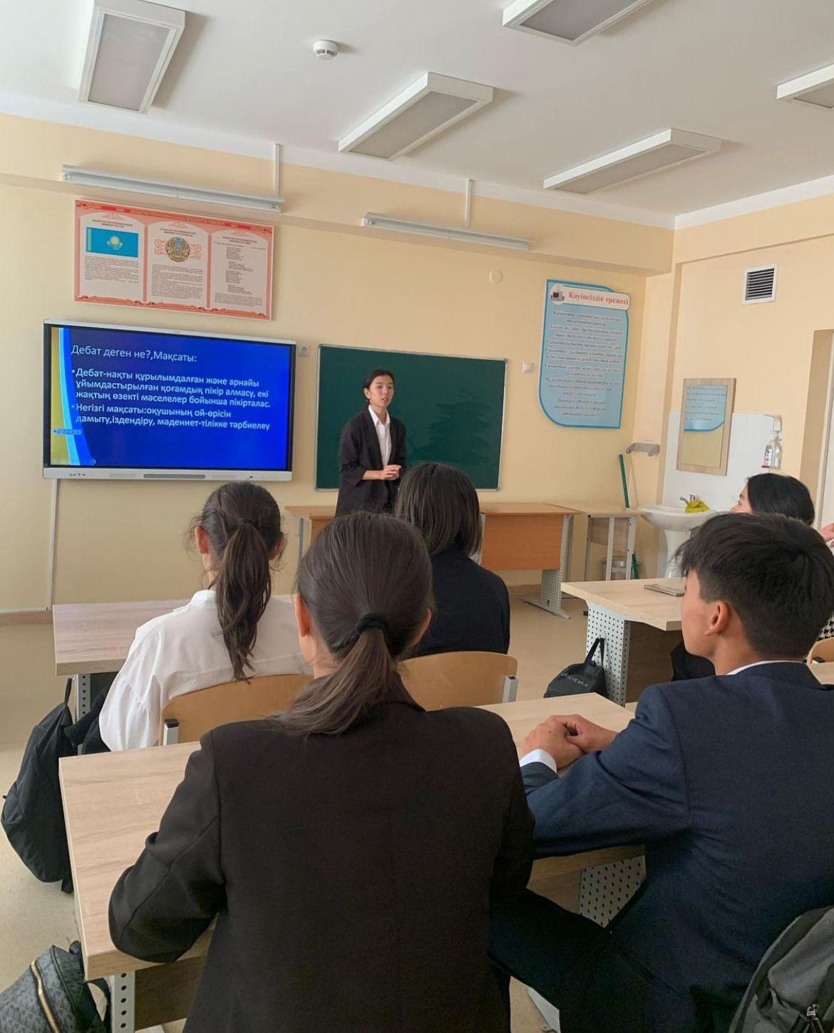 Мектебімізде «Ұшқыр ой алаңы » атты тақырыпта 8-9-10 сыныптар арасында дебат өткізілді. Оқушылар өздерінің дебатқа деген қызығушылықтарын білдірді. Дебаттың мақсаты : бала тәрбиесінің ең үлкені- оны өз тілін құрметтеуге баулу.
