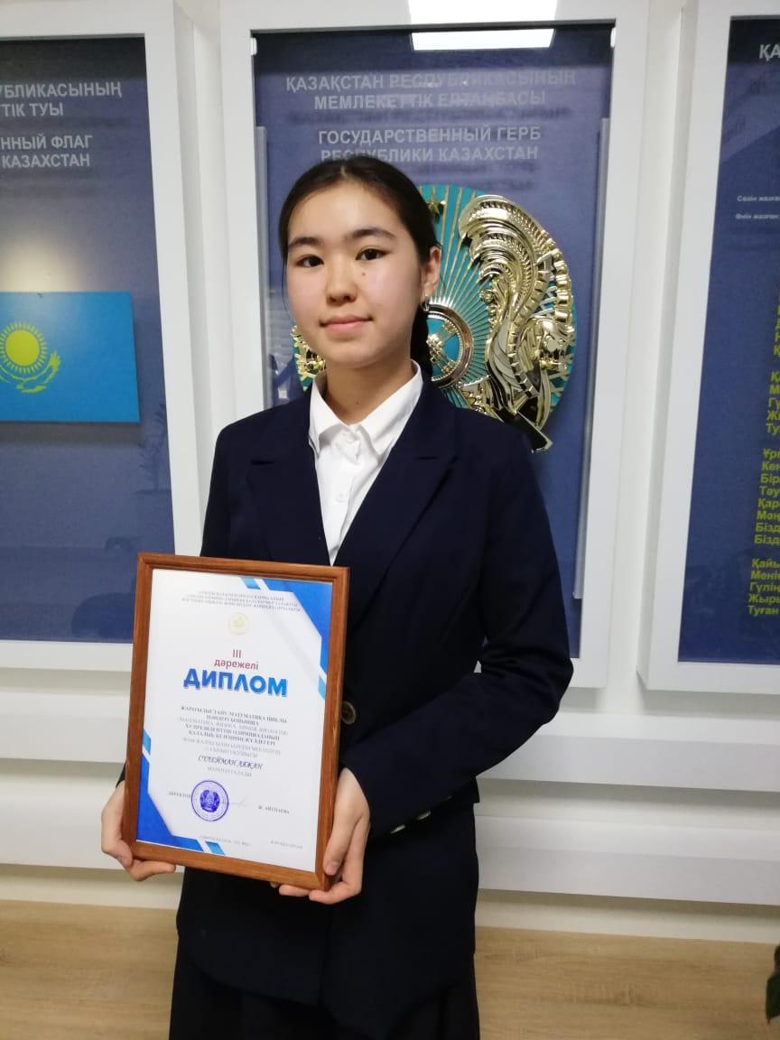 Жаратылыстану-математика циклы пәндері бойынша XV президенттік олимпиаданың қалалық кезеңінің ІІІ дәрежелі диплом иегері мектебіміздің 11 "А" сынып оқушысы Сүлейман Аяжан.