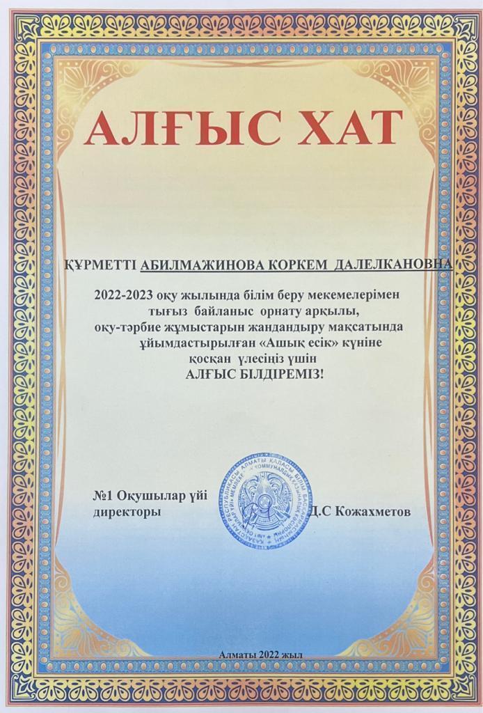 2022-2023 оқу жылында білім беру мекемелерімен тығыз байланыс орнату арқылы, оқу-тәрбие жұмыстарын жандандыру мақсатында ұйымдастырылған “Ашық есік” күніне қосқан үлесі үшін №164 жалпы білім беретін мектеп марапатталады.