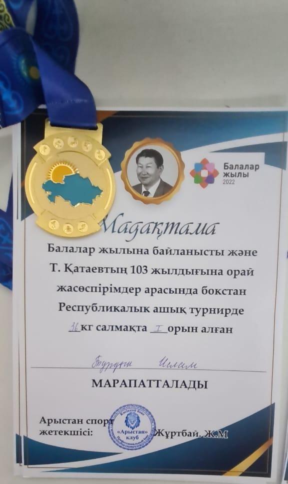 Балалар жылына байланысты және Т.Қатаевтың 103 жылдығына орай жасөспірімдер арасында бокстан Республикалық ашық турнирде 36 кг салмақта 6 "Г" сынып оқушысы Тұрдын Ислам I-орын иеленді. Құттықтаймыз!!!