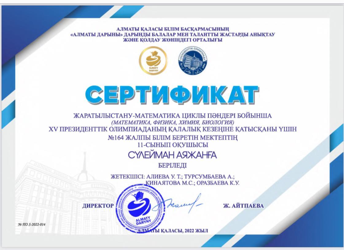 №164 Жалпы білім беретін мектеп » Ақпарат » Жаратылыстану-математика циклы пәндері бойынша XV президенттік олимпиаданың қалалық кезеңіне қатысқаны үшін мектебіміздің 11 сынып оқушылары А.Сүлейман мен А.Журабеков сертификатқа ие болды.