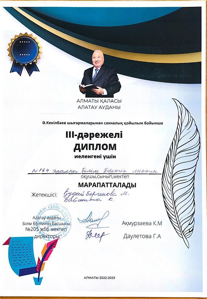 Аудандық Әбіш Кекілбаев оқуларына жазушының шығармаларынан сахналық қойылым бойынша мектебіміздің оқушылары жүлделі ІІІ орынға ие болды. Жетекшілері қазақ тілі мен әдебиеті пәні мұғалімдері М.Құдайбергенова, К.Байатта