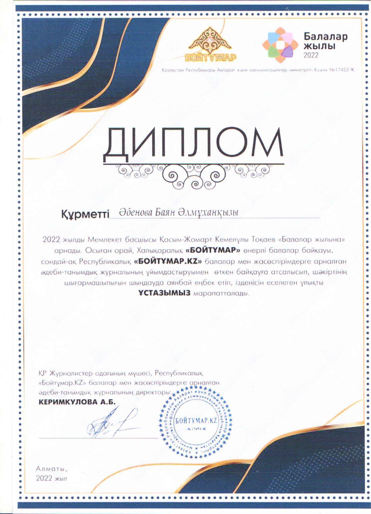 Республикалық "БОЙТҰМАР.KZ" балалар мен жасөспірімдерге арналған әдеби-танымдық журналы ұйымдастырған, ҚОЛӨНЕР номинациясы бойынша 1 "В" сынып оқушысы И.Ибраймовтың жұмысы үздік деп танылып, жүлделі ІІ орынға ие болды.
