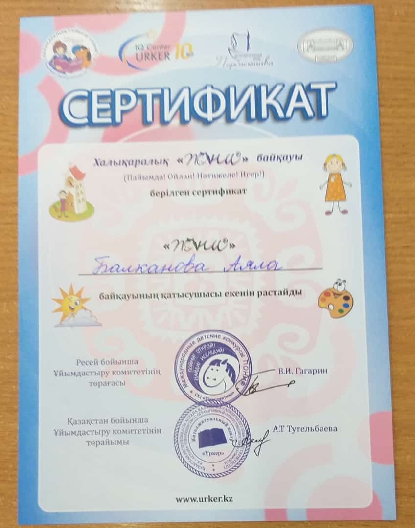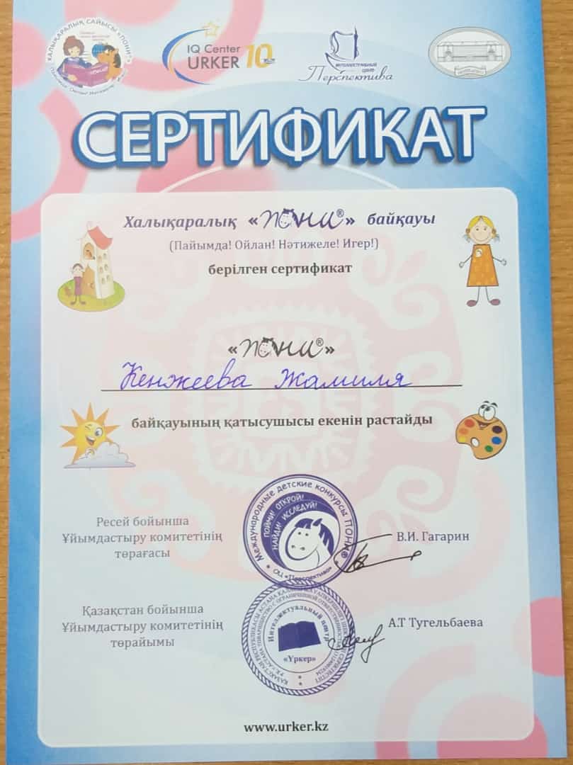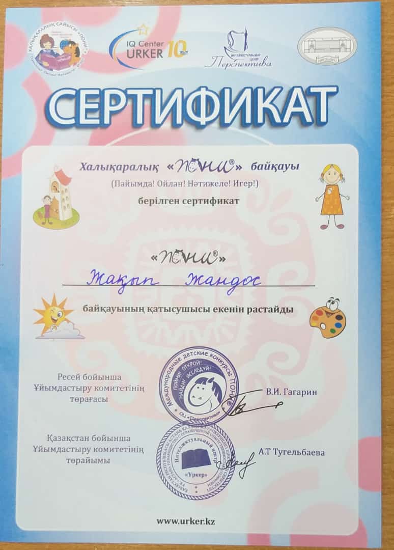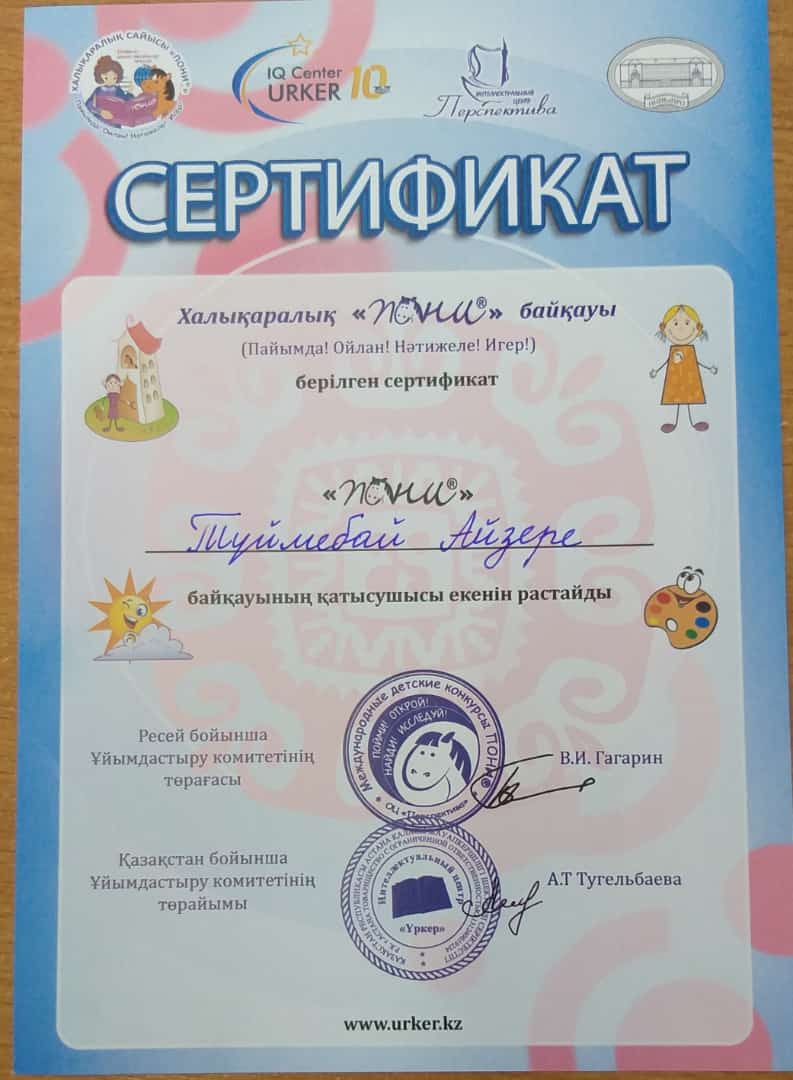 Халықаралық "ПОНИ" байқауына 2 "Б" сынып оқушылары А.Кенжебулат, А.Балканова, Ж.Кенжеева, А.Түймебай, Ж.Жақыптар қатысып, сертификат алды. Жетекшісі, бастауыш сынып мұғалімі Ж.Болысбекова