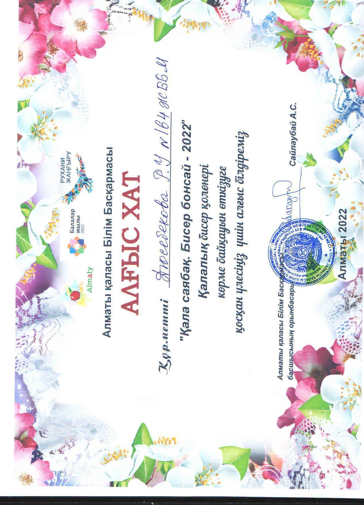 Алматы қаласы Білім басқармасы "Қала саябақ. Бисер бонсай 2022" Қалалық бисер қолөнері көрме байқауына 6 "А"сынып оқушысы К.Болат қатысып, ІІІ орынға ие болды. Жетекшісі, көркем еңбек пәні мұғалімі Р.Дюсебекова.