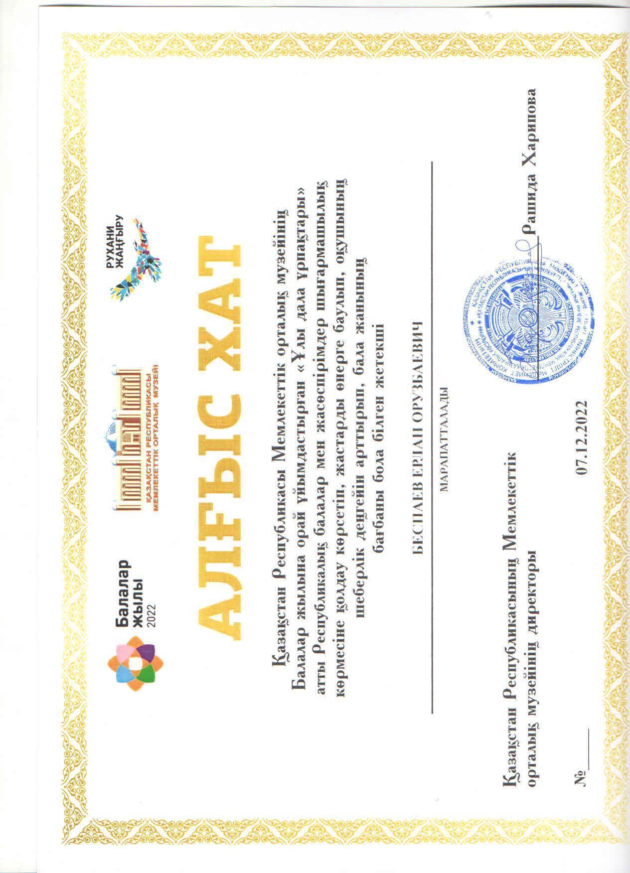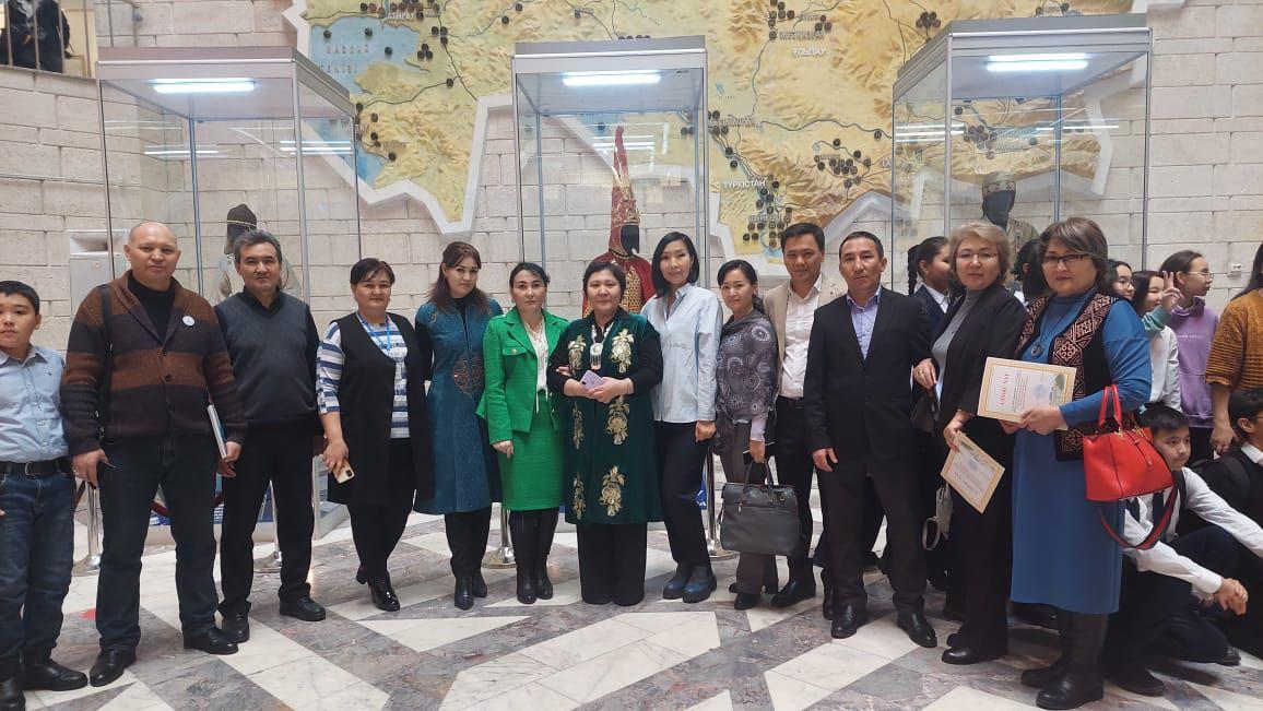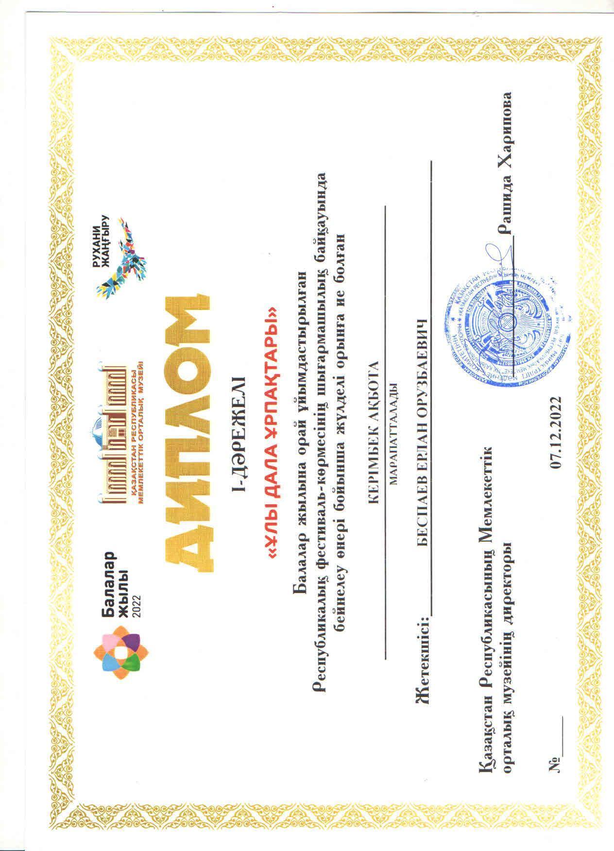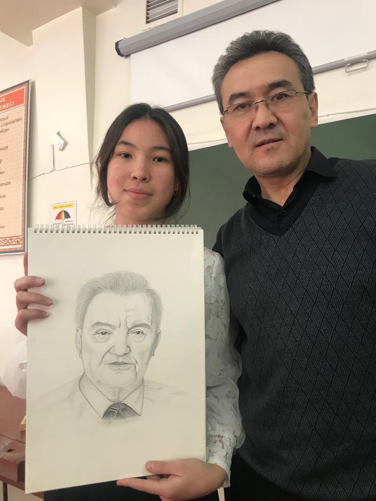 "Ұлы дала ұрпақтары" Республикалық фестиваль көрмесінің шығармашылық байқауында бейнелеу өнері бойынша жүлделі І орынға ие болған 9 "Г" сынып оқушысы А.Керімбек, жетекшісі көркем еңбек пәні мұғалімі Е.Бейспаев