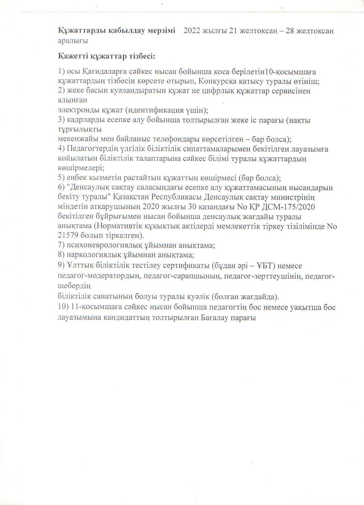 21 желтоқсан 2022 0 1 2 3 4 5 21-28 желтоқсан аралығында қазақ тілі мен әдебиеті пәні мұғалімінің уақытша бос лауазымына конкурс жарияланады Осы беттің QR-коды:QR-код этой страницы: